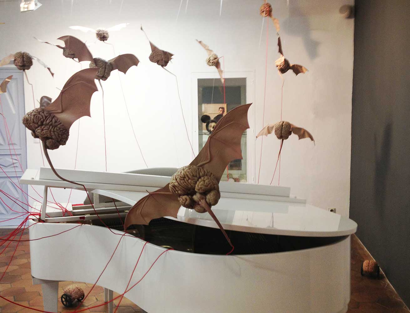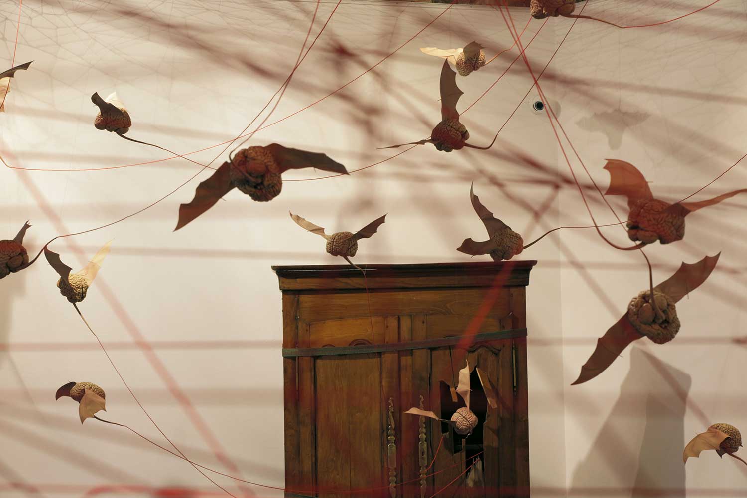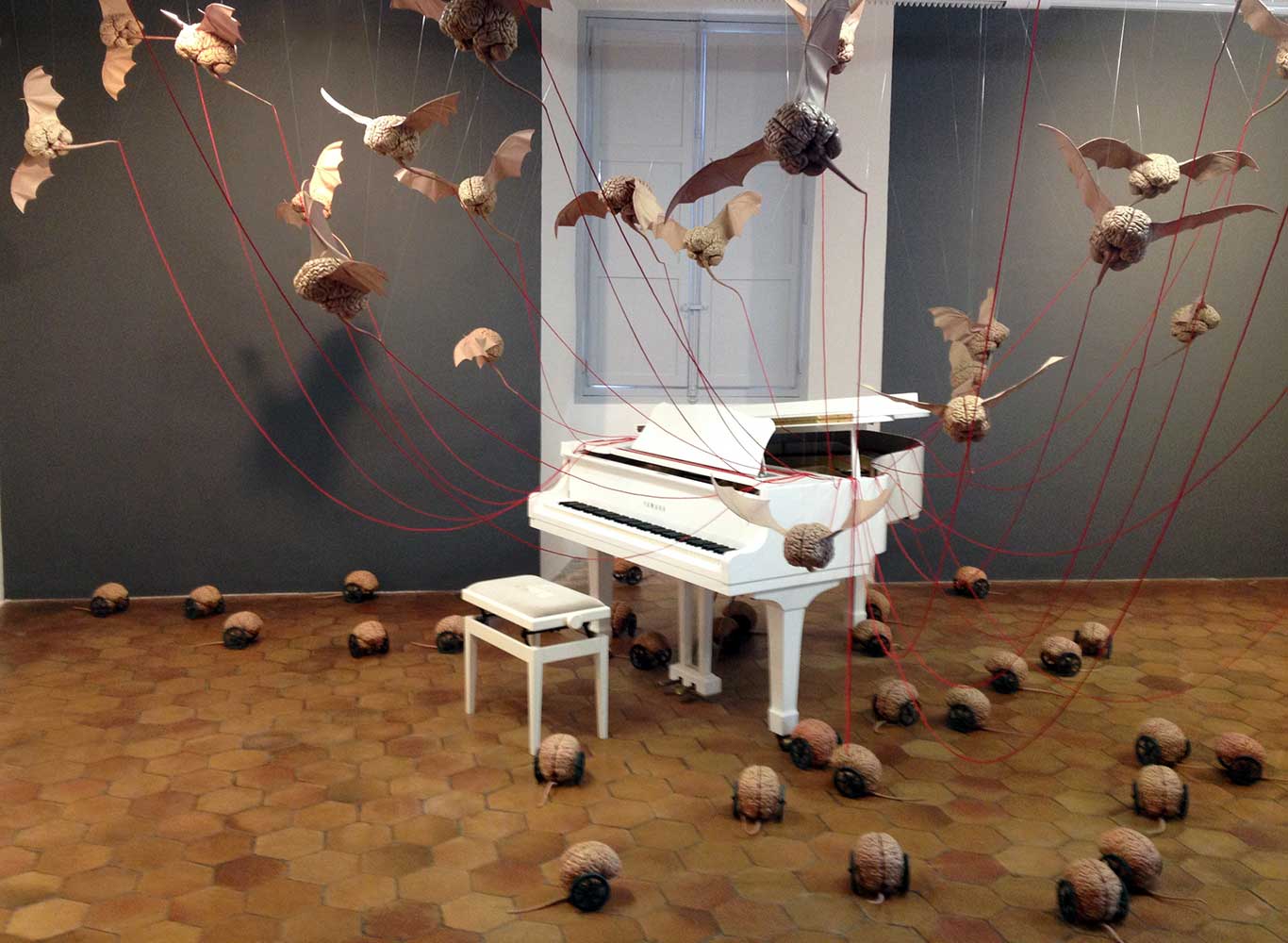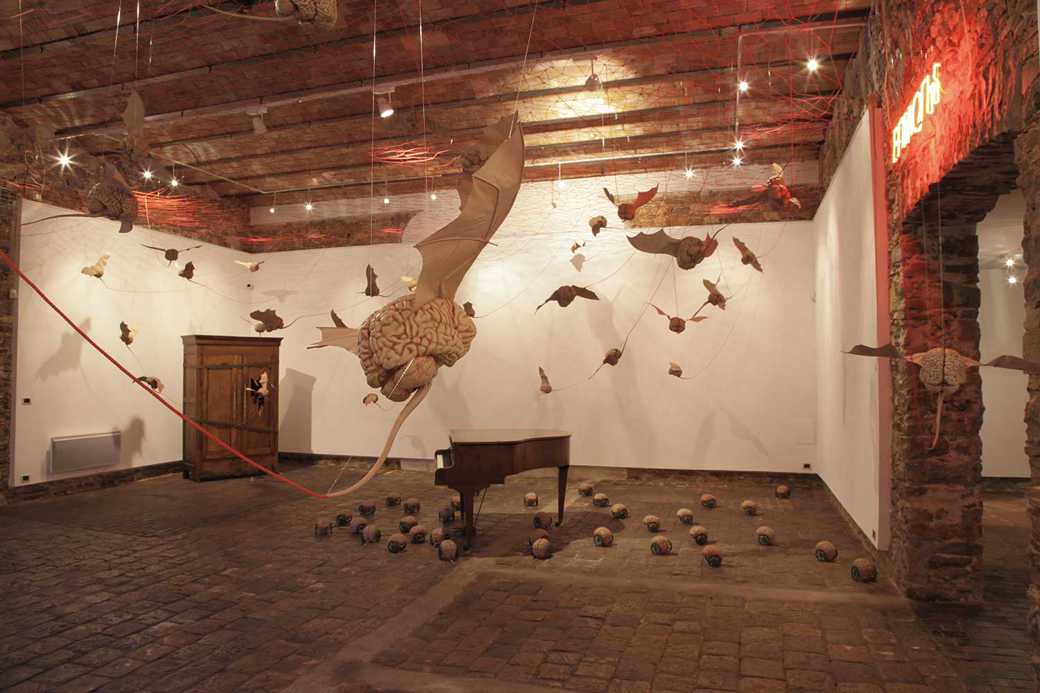 Installation sur 200 m2, 63 cerveaux volants et 63 cerveaux roulants (résine polyuréthane, acier, film polyester thermorétractable), un cerveau surdimensionné (résine polyester, acier, garcette noire), piano quart de queue, armoire et malles anciennes, mâchoires de requin, néon, garcette rouge