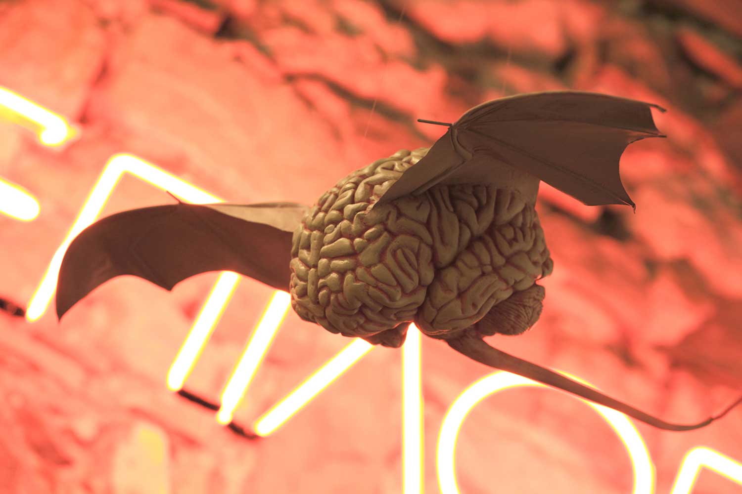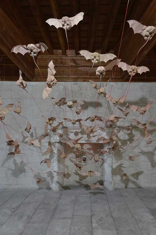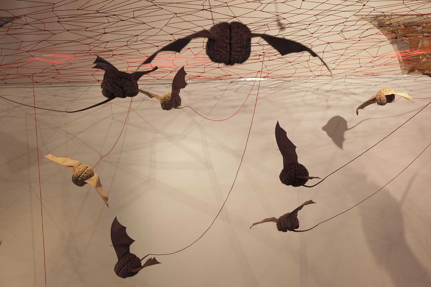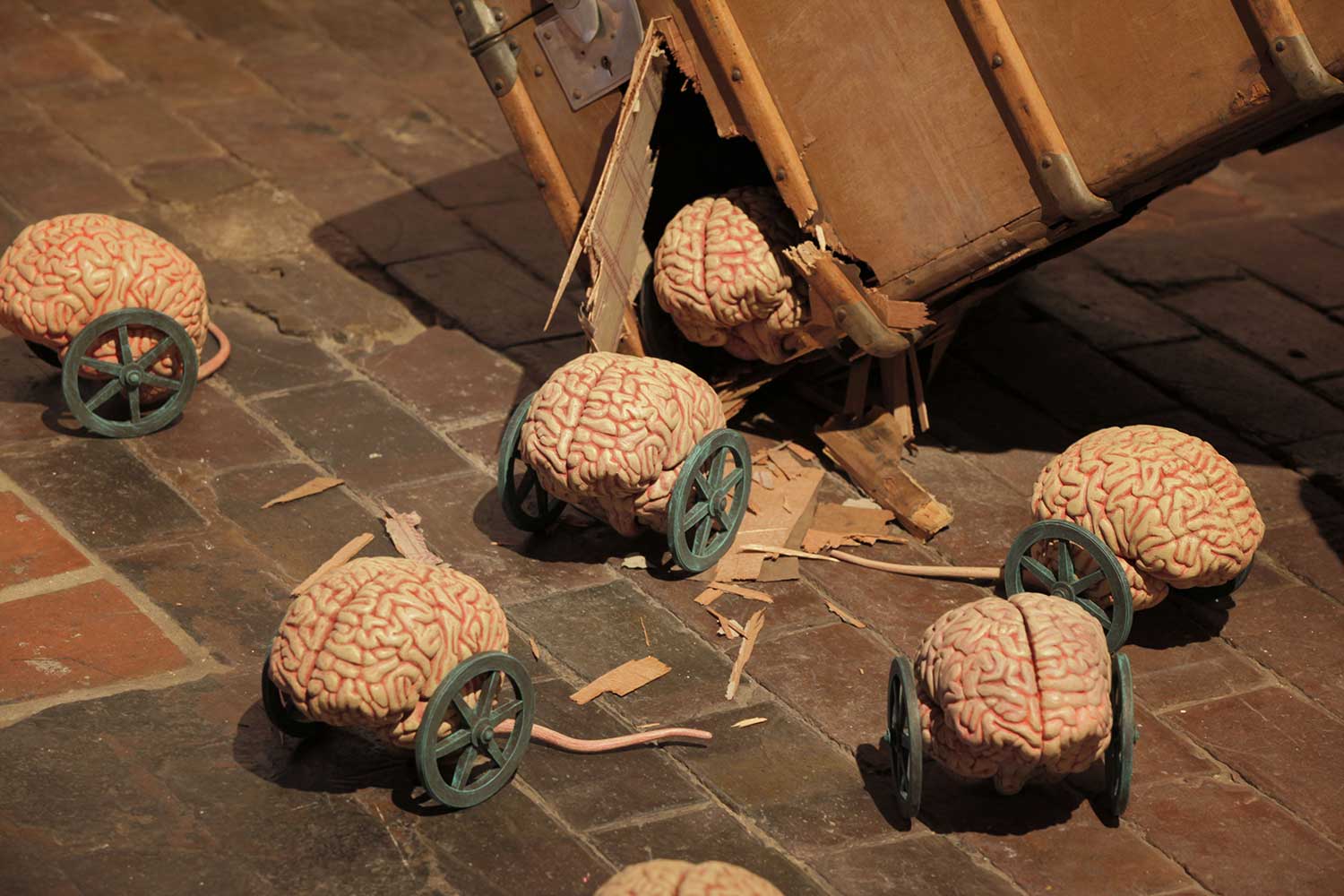 Installation sur 200 m2, 63 cerveaux volants et 63 cerveaux roulants (résine polyuréthane, acier, film polyester thermorétractable), un cerveau surdimensionné (résine polyester, acier, garcette noire), piano quart de queue, armoire et malles anciennes, mâchoires de requin, néon, garcette rouge