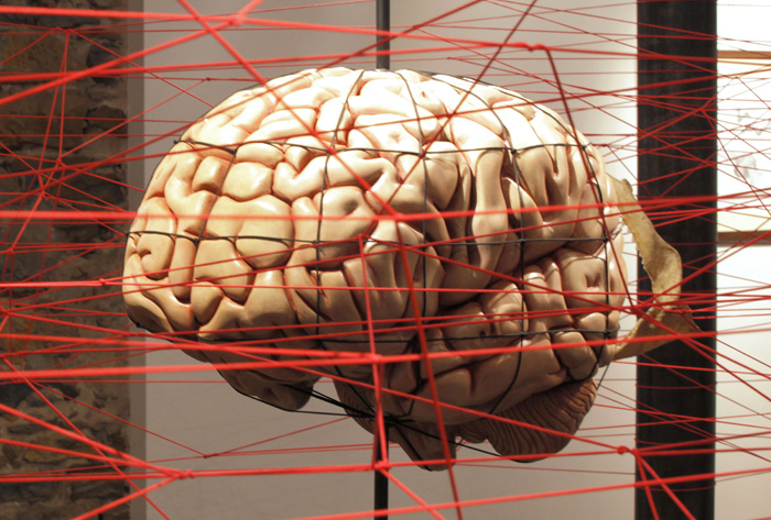 Installation sur 200 m2, 63 cerveaux volants et 63 cerveaux roulants (résine polyuréthane, acier, film polyester thermorétractable), un cerveau surdimensionné (résine polyester, acier, garcette noire), piano quart de queue, armoire et malles anciennes, mâchoires de requin, néon, garcette rouge