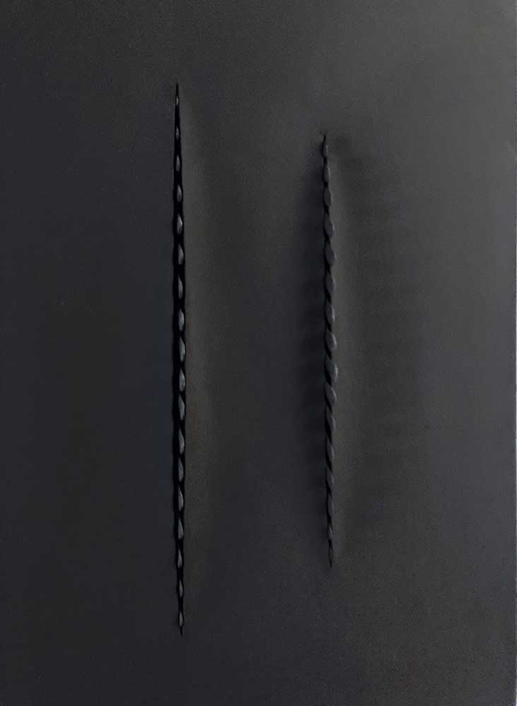Si ces œuvres citent évidemment Lucio Fontana se référant au Spatialisme et à la volonté de synthétiser la vibration, le mouvement et l’espace dans une même œuvre, je suis arrivé à ces formes de manière empirique, par tâtonnements, avec un résultat inverse dans le mouvement à celui de l'artiste italien (c’est-à-dire que les lèvres de l’incision s’ouvrent vers l’extérieur de la toile, alors que les incisions de Fontana s’ouvrent vers le châssis).