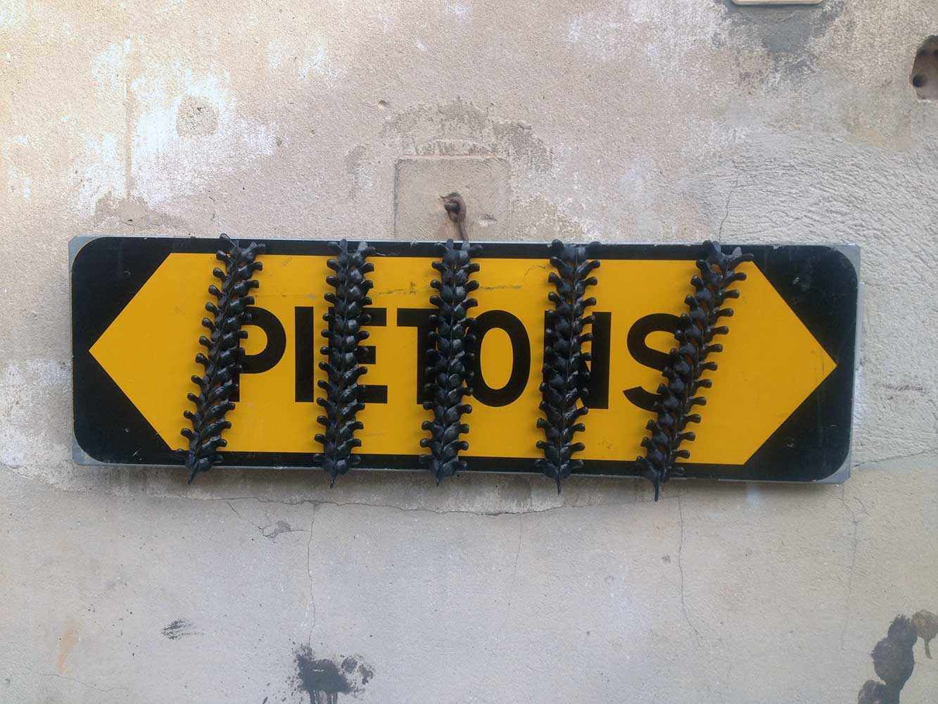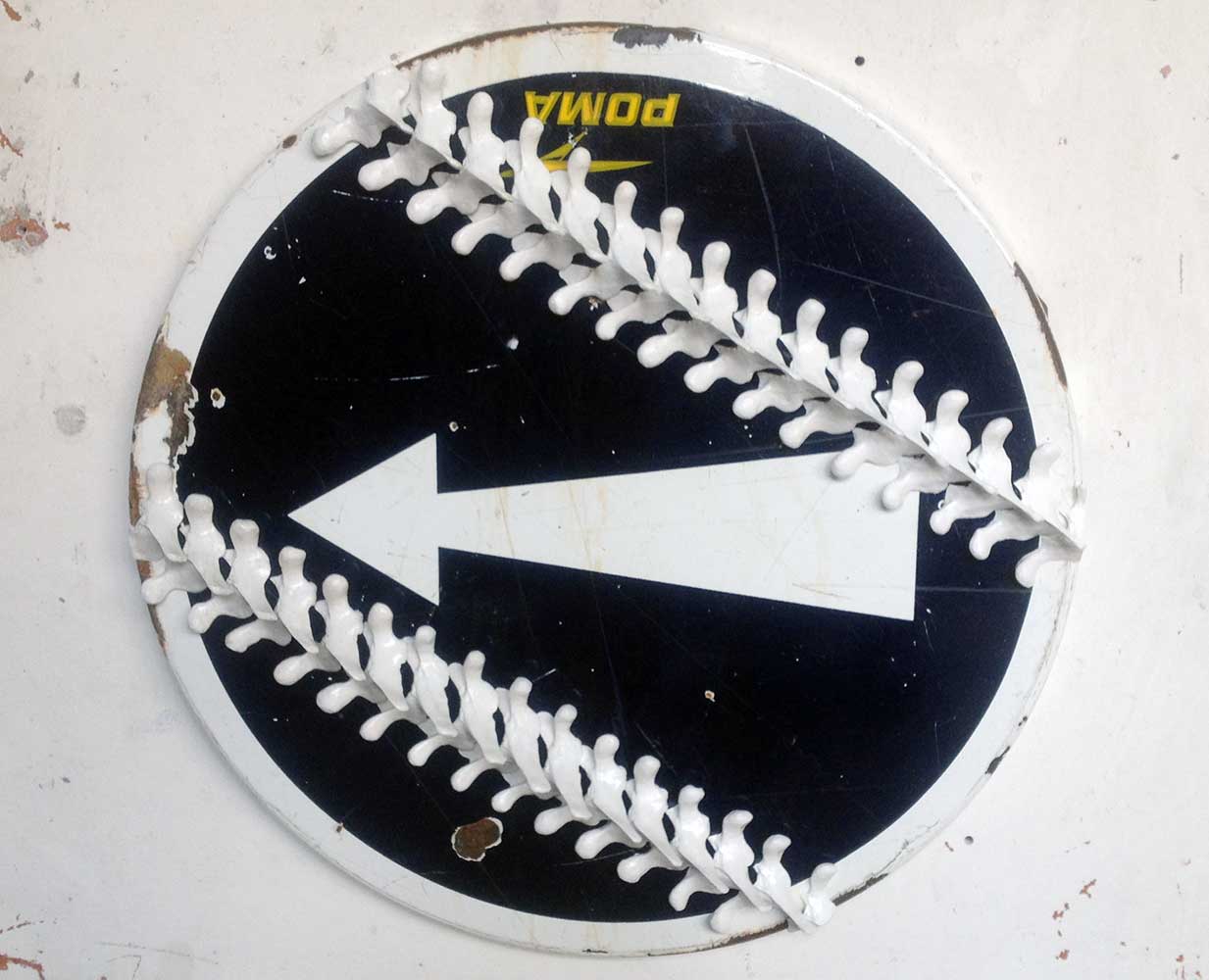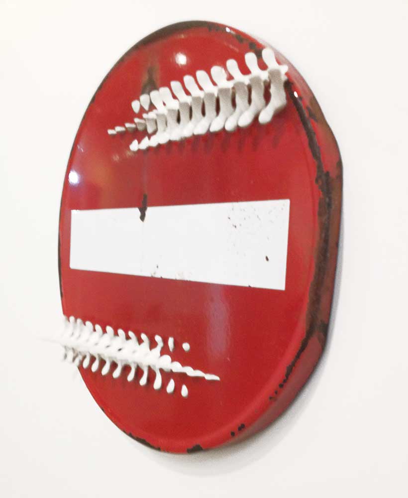 Des panneaux de signalisation traversés par des lignes de vertèbres, comme une intégration de l’humain dans ces signes créés par lui pour organiser le monde dans lequel nous vivons. Une manière de nous confronter à notre destinée…