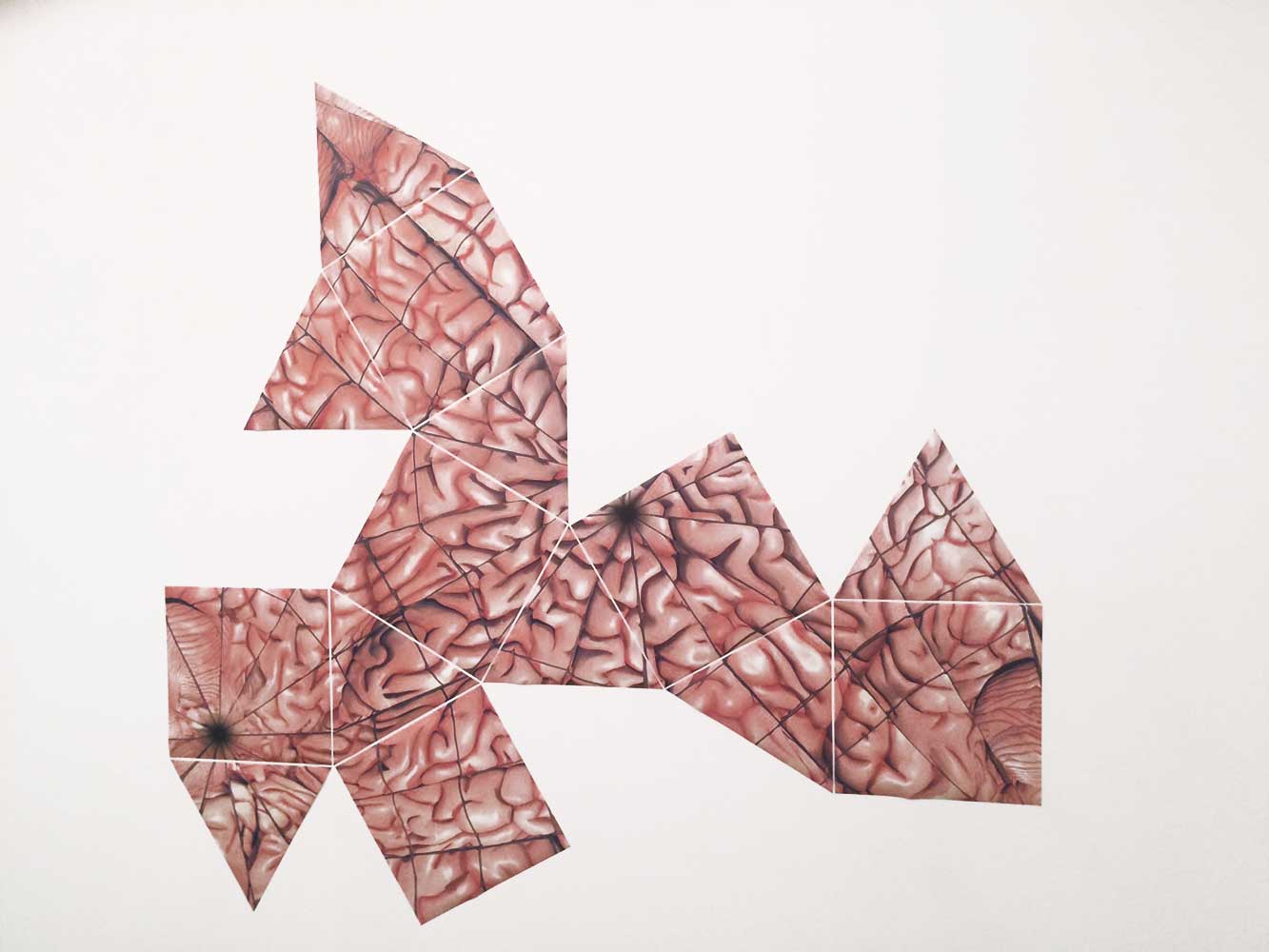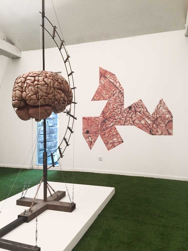 A l’heure où le réseau 2.0 tend à remplacer le réseau neuronal, cette installation renvoie à la matérialité du cerveau et des os. Elle est à la fois un autoportrait d’artiste isolé dans son univers et un questionnement sur la place de l’homme dans le cosmos.