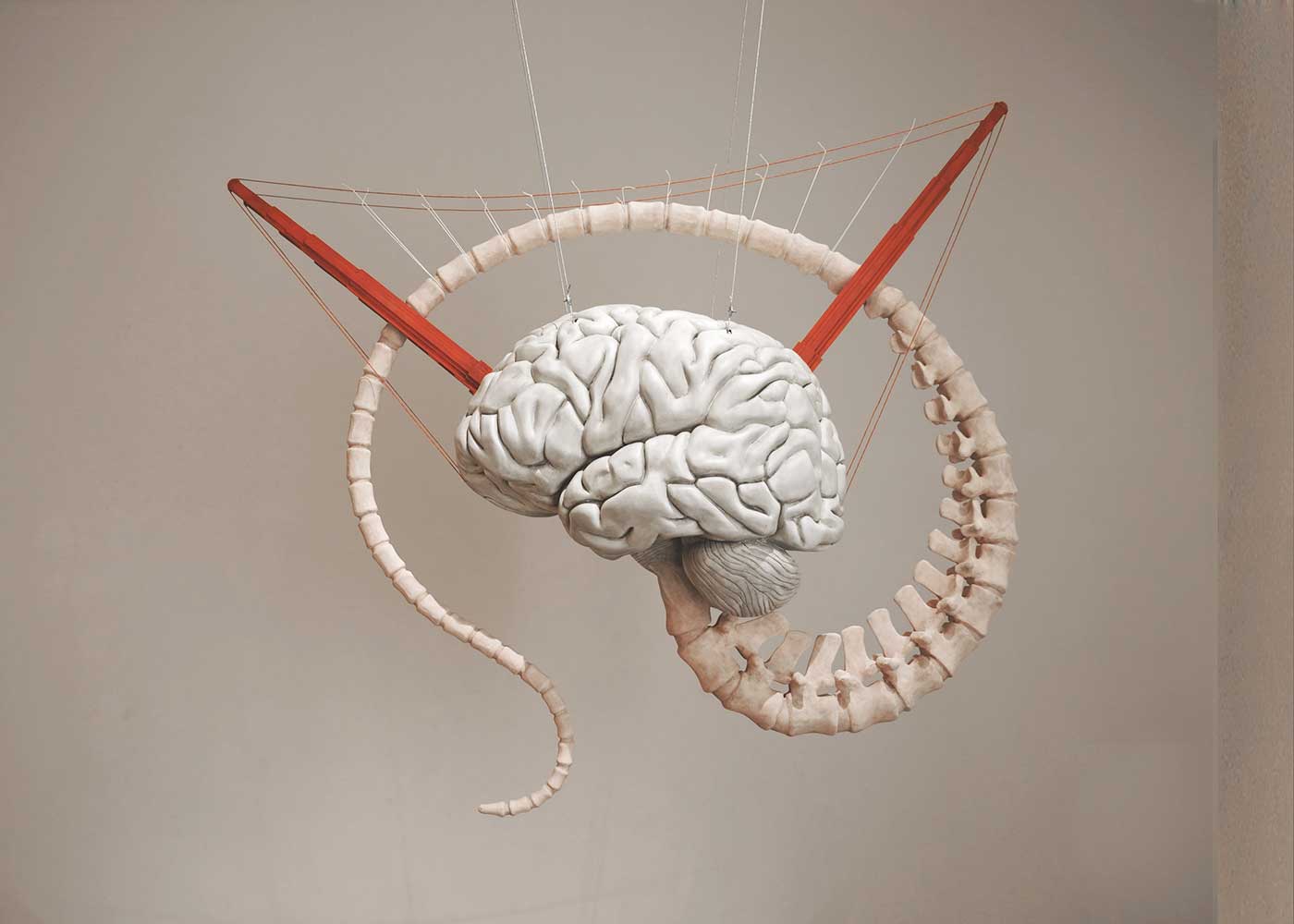 Un cerveau surdimensionné flotte dans l’espace, une suite de vertèbres l’entoure comme un anneau rose et lui donne ainsi une allure de planète aux couleurs lunaires.
