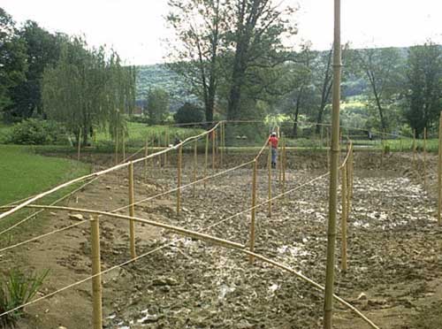 Création d’un étang de 27 X 30 m pour assurer le développement de batraciens (concept d’opéra biotique). L’ensemble est protégé d’une structure en bambou pour réduire l’accès aux oiseaux prédateurs