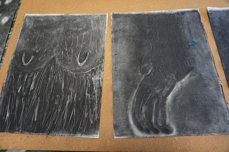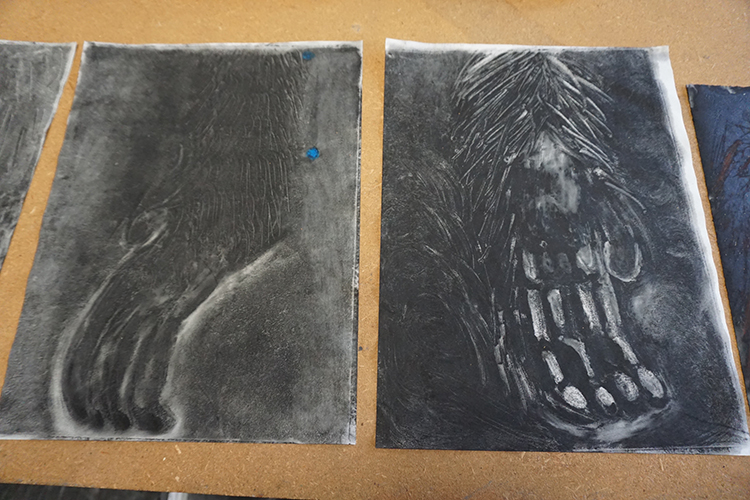 Les deux établis ne se ressemblaient pas. L'un servait à disposer les outils graphiques, l'autre à se débarrasser de la poussière, à la ranger dans un sac, à faire comme si la brillance et les refets étaient plus réels que le soleil et sa pluie. Les outils s'alignent dans la lumière, les colles et les tissus attendent dans un sac. Il faut frotter longuement la surface avec du charbon. Les yeux se mettent à briller dans la pénombre, noirs de feu. Les dents grimacent imbéciles. Quelques feuilles d'arbre tombent. Pendant ce temps, les fabriques travaillent à la transformation de la matière première, à son lissage, à sa blancheur immaculée, à ses bords rectilignes, à sa légèreté, à la précision de sa coupe. Vivre en orang-outang de la peinture. Ne pas mâcher ses mots.