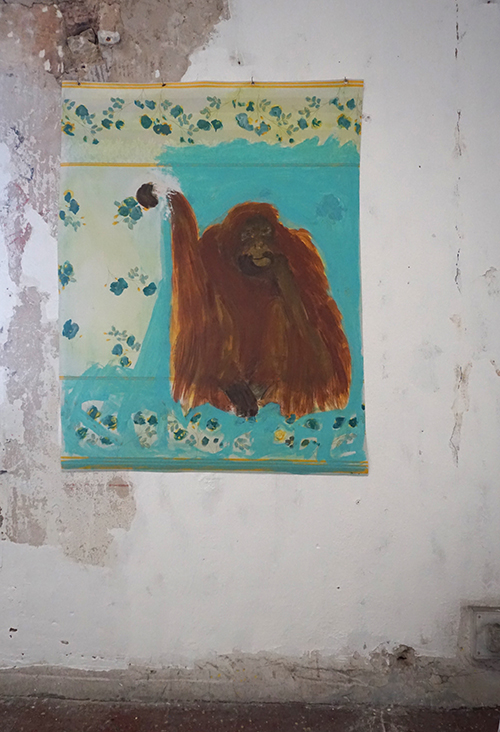 Engrangée par les importantes dénivelées qui ruissellent, l'eau se précipite, de partout, grise, opaque et sourde. La colline tombe sous la roche, sa petite pluie enserre les cailloux de l'autel jusqu'aux sillons de la pyramide. Les gouttes freinent, sur le pelage roux et prédisposé. Les boucles de poils protègent de la pluie, mais pas de la peinture. En plein dans le mille, paf, sans panneau, rien, pas d'appel, pas de nouvelles ni d'annonces. Les hommes broyés par la machine dans un intérieur quotidien, au milieu de la cuisine, et les pieds des singes maladroits au sol mais si agiles autour des troncs et dans les branches, la peinture les connaît et elle les tait. La femme regarde comment l'ongle gratte la terre et apprend à enfouir les friandises. Elle retrace le berlingot de couleur sur des motifs d'imprimés feuris. Le doute prend la pause et une émulsion s'en suit. Beige, jaune, rose, bleu irisé, les couleurs des tempêtes calmes l'éloignent. On entend le bruit des amortisseurs. La brume du sol goudronneux ralentit une fois que les orangs-outangs crépitent partir piétiner. L'arbre à palabre les a conduits dans la boue. Ils en savaient trop. Les singeries de trois-quart, les roux sans chevelures, l'attente au combat, ils sont là, ils nous touchent, ils nous peignent du regard.