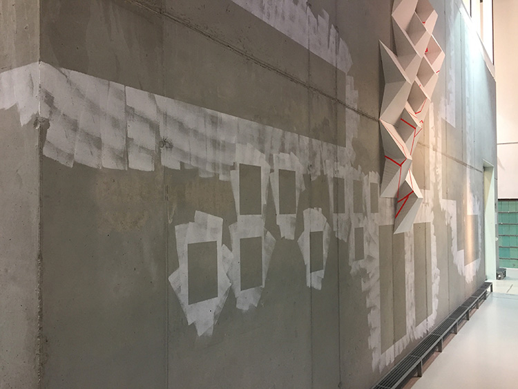 Installation en collaboration avec Ursula Döbereiner ; dans l'exposition : Vielschichtig. Von der Räumlichkeit der Flächteilung, Brandenburgisches Landesmuseum für moderne Kunst, Cottbus, 2019