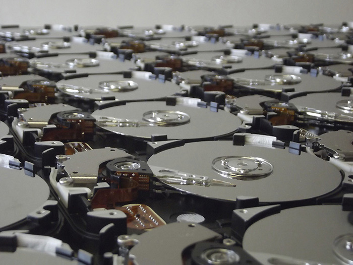 35 disques durs modifiés en haut-parleurs. La forme de l’installation peut varier. Seul est important le fait de respecter le titre, qui n’est autre que la description de l’installation: 35 disques durs haut-parleurs jouant l’enregistrement audio de leur propre titre, enregistrement étiré à la durée de l’exposition. Il en résulte une chorégraphie logique des bras de lecture, dirigés par les infra-basses de la piste son, et générant, par les chocs successifs contre les disques, leur propre interprétation d’eux-mêmes, une “introspection” sonore. |