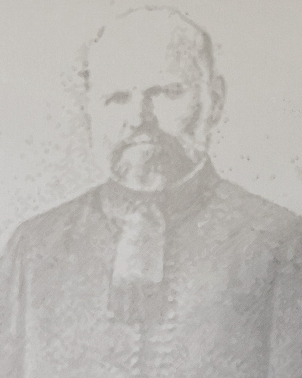 | Il s’agit d’un dessin fait au pinceau, à l’eau savonneuse, d’après une photographie du 19ème siècle, sur un support de ciment gris mat. L’image évanescente du médecin maudit est donc constituée du résidu gras du savon - à l’huile de lin - qui tache le support de ciment, après l’évaporation de l’eau. Ce procédé, produit une image «évaporée» qui donne l’impression d’apparaître ou de disparaître, m’a semblé juste pour rendre compte de la vie de Semmelweis et de la trace qu’il a laissé dans l’Histoire. Fin observateur, pionnier de la médecine moderne, féministe avant l’heure, Ignace Semmelweis a pourtant un destin tragique et n’accèdera jamais à la reconnaissance. Ma résidence à la Savonnerie du Midi a été retardée à cause du 1er confinement dû à la pandémie de Covid 19. Durant cette période, le savon (et celui de Marseille en particulier) a quitté son image essentiellement pittoresque pour devenir la seule arme (à l’époque) contre la pandémie. Mes recherches en ont été subitement bouleversées. Ignace Semmelweis (1818 – 1865) est un médecin obstétricien hongrois qui œuvra pour l’hygiène des mains. À l’hôpital de Vienne, les étudiants en médecine passent quotidiennement des salles d’autopsies aux salles d’accouchements, entraînant 25% de mortalité des femmes par infection. Semmelweis démontra que le lavage des mains diminuait considérablement les décès post-accouchements. Rompant avec les croyances scientifiques de son époque, Semmelweis est rejeté par ses pairs et meurt oublié dans un asile psychiatrique. |