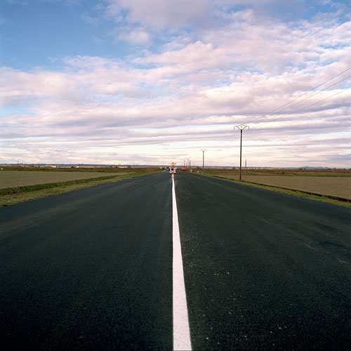 Maciek retouche les images mais il n’est pas question de seul repentir photographique. Il y a quelque chose de la post-production, de la mise en scène. Il soigne les éclairages, les décors, les costumes. Il arme son appareil sur le terrain et ensuite désarme les détails sur un ordinateur. Les travailleurs de la route, les échos anonymes du photographe dans l’image, ont des petits rôles de figurants. Ils semblent appartenir à une tribu sauvage-fluo qui vit là où l’image a été prise. Ils grattent la terre pour ses racines et jettent des lignes de pêche sur la route pour se nourrir.Il y a aussi quelque chose de l’épure (suppression de sigles, de plaques minéralogiques, d’évidences...), celle qui marque la différence entre l’observation et le regard, entre le document et le souvenir, entre le trop perçu et l’émotion. Celle qui indique la voie. Celle qui dépayse.