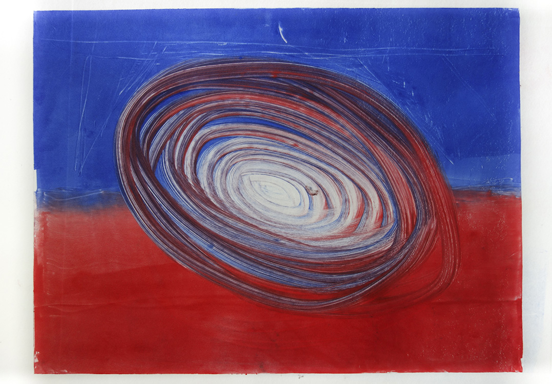 « Lorsque, à l’atelier, je contactais pour la première fois une feuille de papier contre une plaque de verre gouachée, je ne savais pas que j’expérimentais le monotype. J’ai repris cette technique par la suite avec une presse, attirée par un procédé qui tient à la fois de l’empreinte et de la révélation, et met à distance le geste pictural. Il m’importait aussi de négocier la place de l’impression fantôme au-delà d’une simple trace de l’œuvre originale ou de son double atténué ; d’explorer les possibilités d’une image duelle, en contrepoint de l’idée de pièce maîtresse.