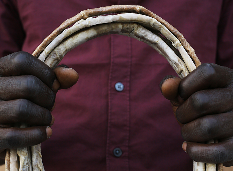 C. T. : Il y a plusieurs visuels de mains au sein de l’exposition relatant des actions que j’ai menées dans des espaces géographiques différents. Dans la série Talismans, des mains arborent des objets de protection, de « délivrance », objets que je confectionne moi-même, en papier, cuire, corde, cire et tissu, selon un protocole précis (en collaboration avec des marabouts subsahariens pour la réalisation des grilles talismaniques internes favorisant une réussite de passage).