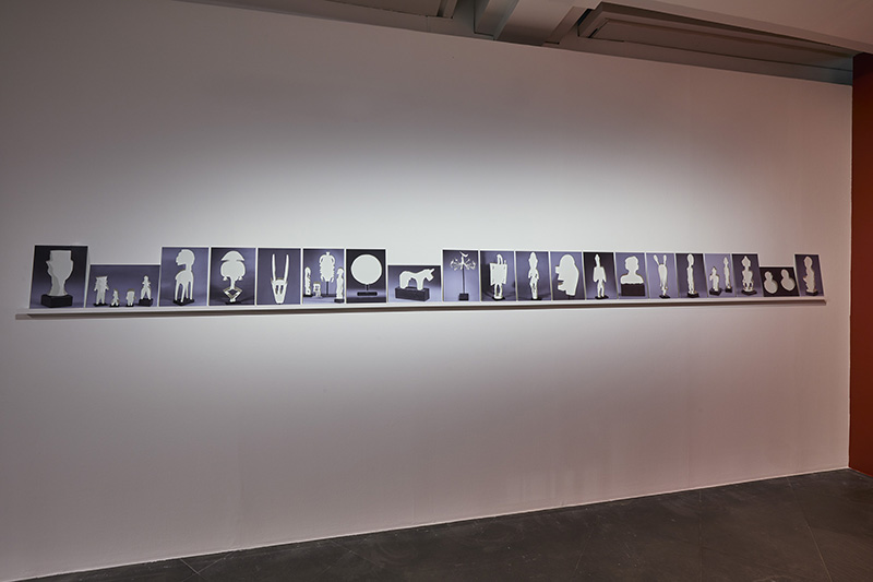 | Le traitement de ces images issues de catalogues de vente aux enchères et catalogues de musées questionne l’appartenance et le statut des objets ethnographiques. L’artiste évide des images de sculptures extra-occidentales de façon à ne conserver que leurs silhouettes fantomatiques. Ce manque évoque l’absence de ces objets dans leur territoire d’origine et le vide laissé en termes de patrimoine, de rituels.... Il matérialise le flou entourant leurs modalités d’acquisition ; comme le rappelle si bien l’auteur et ethnographe Michel Leiris, avec une grande lucidité, il y a eu « collecte » mais aussi « pillage », générant des interrogations au cœur de certaines collections sur la question de leur restitution. |