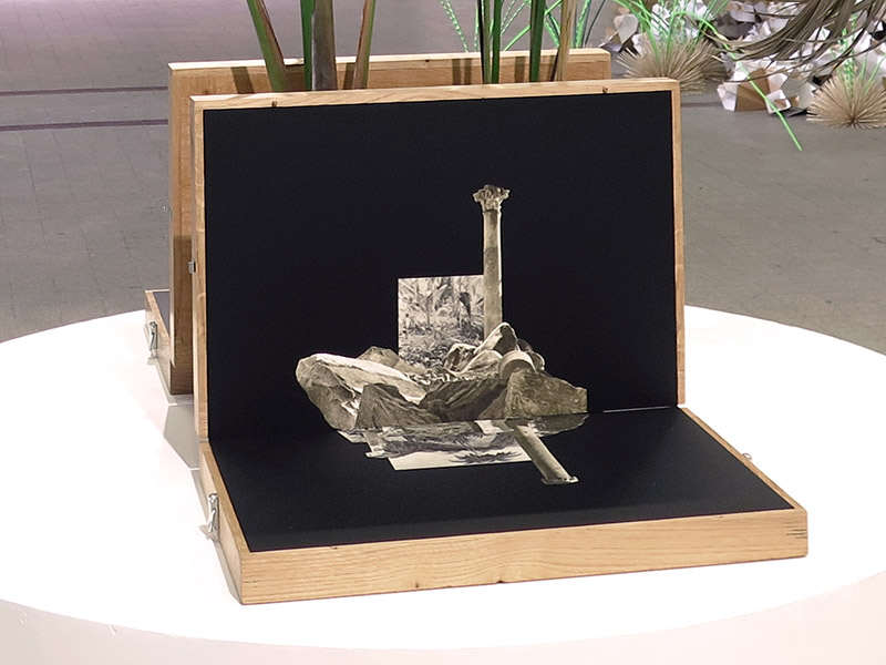Installation, collages papiers sur supports en plexiglas, boitiers-valises en chêne
