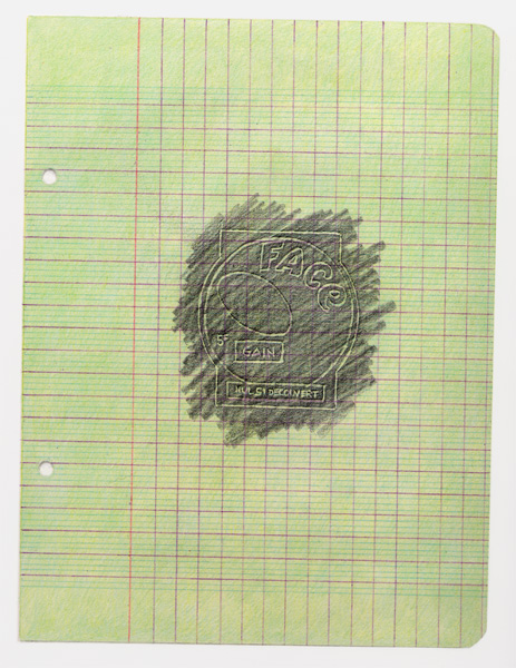 A trompe-l’œil drawing realized using colored pencils and representing a sheet from a school notebook on which figures an imprint of a scratch and win lottery ticket. The ticket is revealed by a graphite rubbing. A connivance exists on the level of dupery between the trompe-lœil and the lottery ticket. |