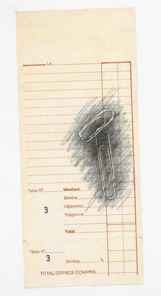 A trompe-l’œil drawing realized using colored pencils and representing a memo pad on which figures the imprint of a crosswordpuzzle. The grid is revealed by a graphite-rubbing. A connivance exists between the lure of the trompe-l’œil and the enigma posed by the crossword puzzle : in these two typesof traps, a particular significance is accorded to the victim’s point of view.