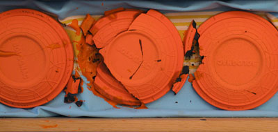 Teinte spectro acrylique sur toile, peinture acrylique, pigeons d’argile, bois, papier thermocollant, papier aluminium, minium de plomb et mine de plomb, 92,5 x 196 cm