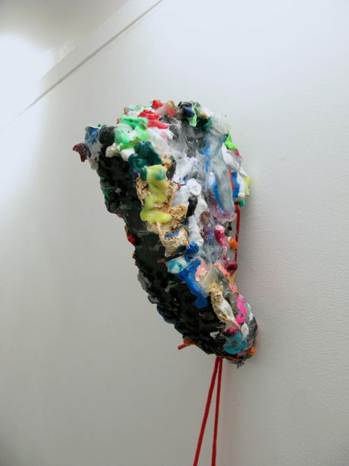 Au milieu de ces productions qui flirtent avec la peinture et la sculpture figurent deux paires d’objets dont l’étrangeté est renforcée par leur dimension burlesque. Comme dans un dessin satirique de Robert Crumb sont accrochées au mur des chaussures de marche engluées sous une épaisse croûte de plastique fondu. L’image de la mythique palette du peintre dans toute son autorité masculine n’est pas loin, si ce n’est que ces brodequins sont « Taille 38 » et pourraient être chaussés par un petit brin de femme-artiste. Juste à côté, posés contre le mur, des bâtons de marche à l’aspect peu ragoûtant rappellent à ceux qui connaissent les penchants scatologiques de la déjà nommée Kiga, les fameux bâtons enduits de matière fécale qui en leur temps firent fuir les amis les plus proches de Gasiorwski comme les tourtes du même ordre qu’il faisait cuire dans le four de son logis…