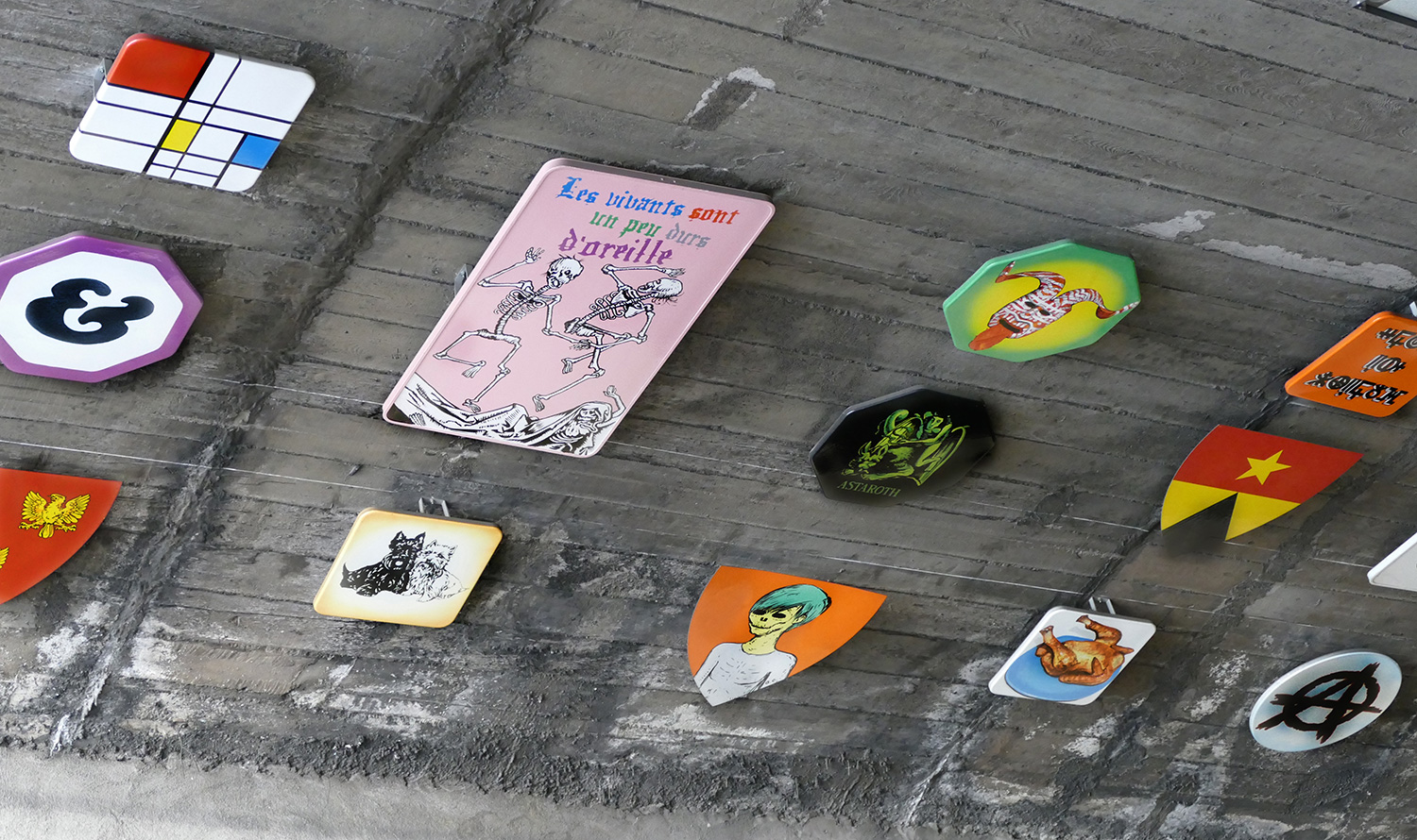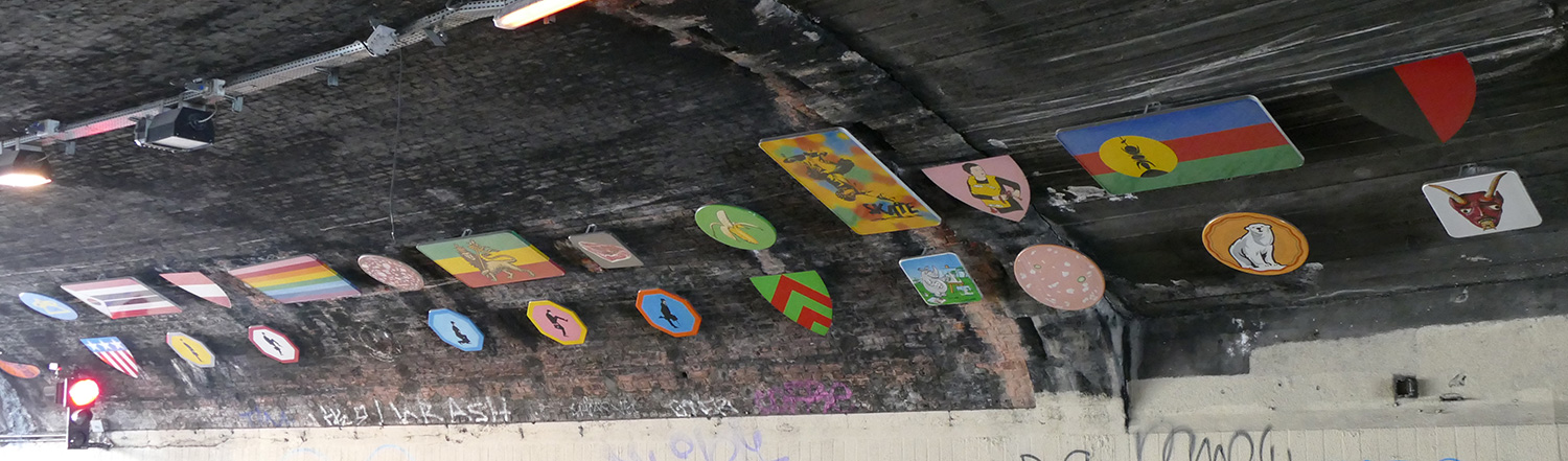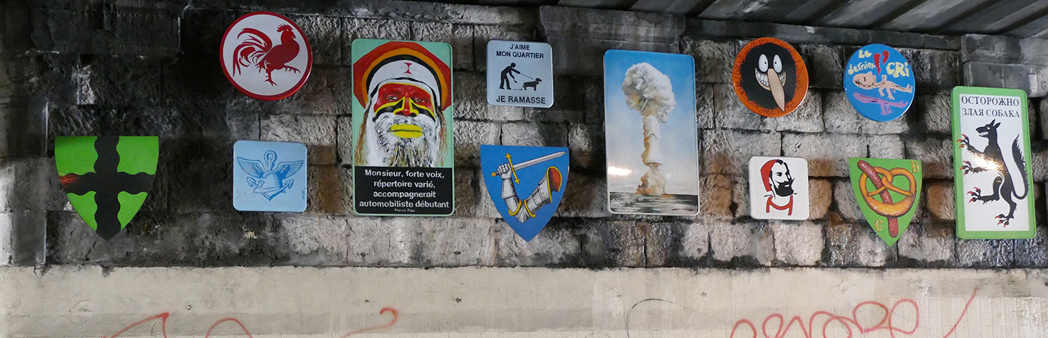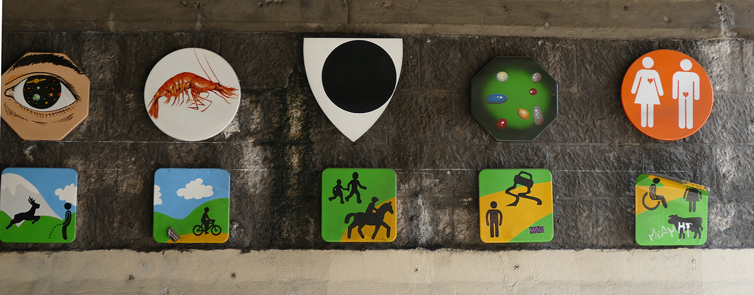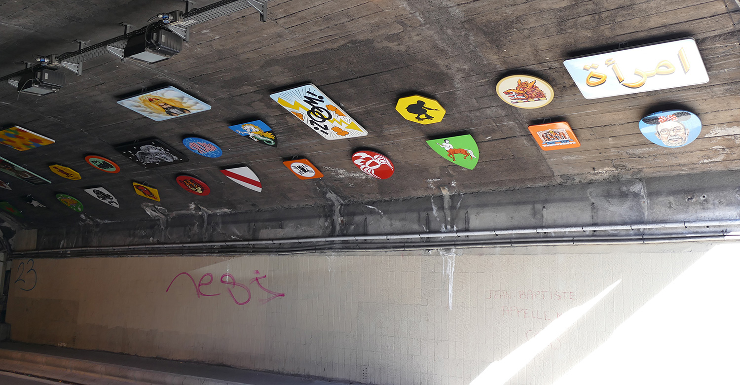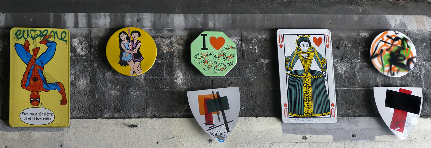 | À partir de son travail iconographique qui mixe très souvent signes, symboles, images indexées à l'histoire aussi bien que ceux de la bande dessinée, le graffiti, tatouages, logos tribaux, l'artiste Frédéric Clavère propose d'installer un ensemble de panneaux peints, à la manière d'une caverne de hiéroglyphes d'un genre nouveau. Une mosaïque de pictogrammes issus de son imaginaire et de celui des habitants ou usagers du quartier. |