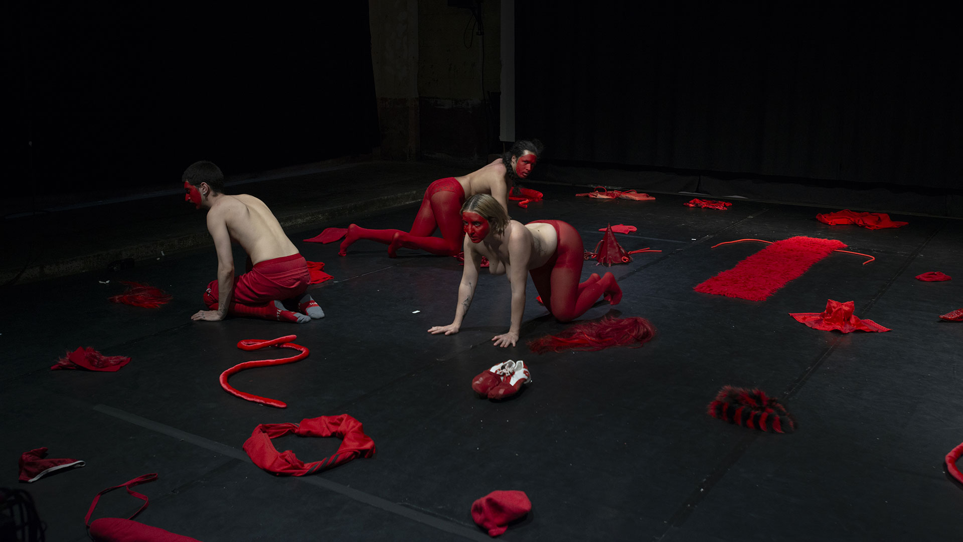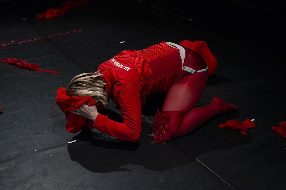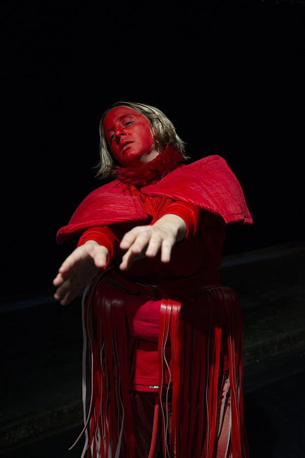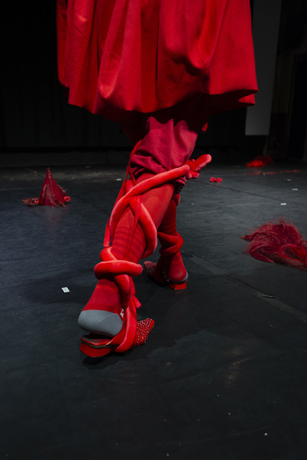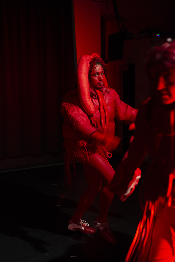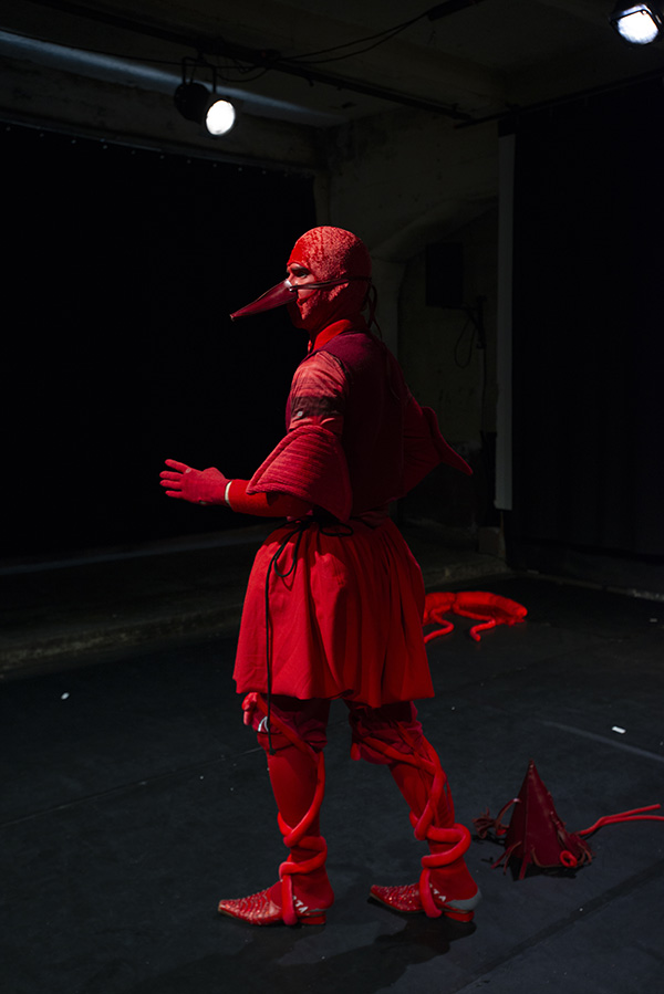 | Le costume y est envisagé comme une partition chorégraphique, dans sa capacité à proposer une manière renouvelée de se déplacer, de s’exprimer, de performer. Des silhouettes se construisent et se déconstruisent, laissant apparaître sous nos yeux des créatures en constante métamorphose, jusqu’au monstrueux. |