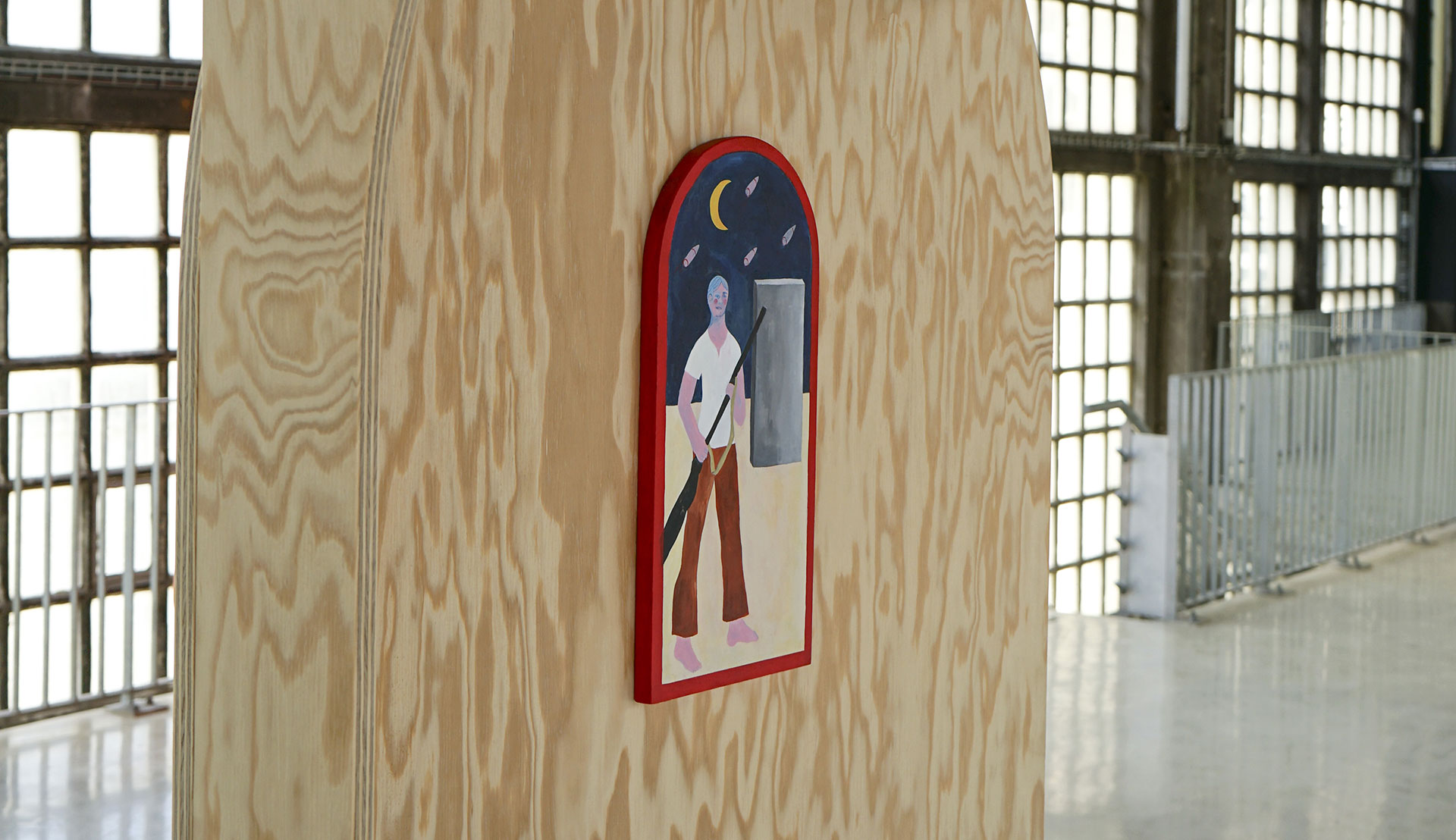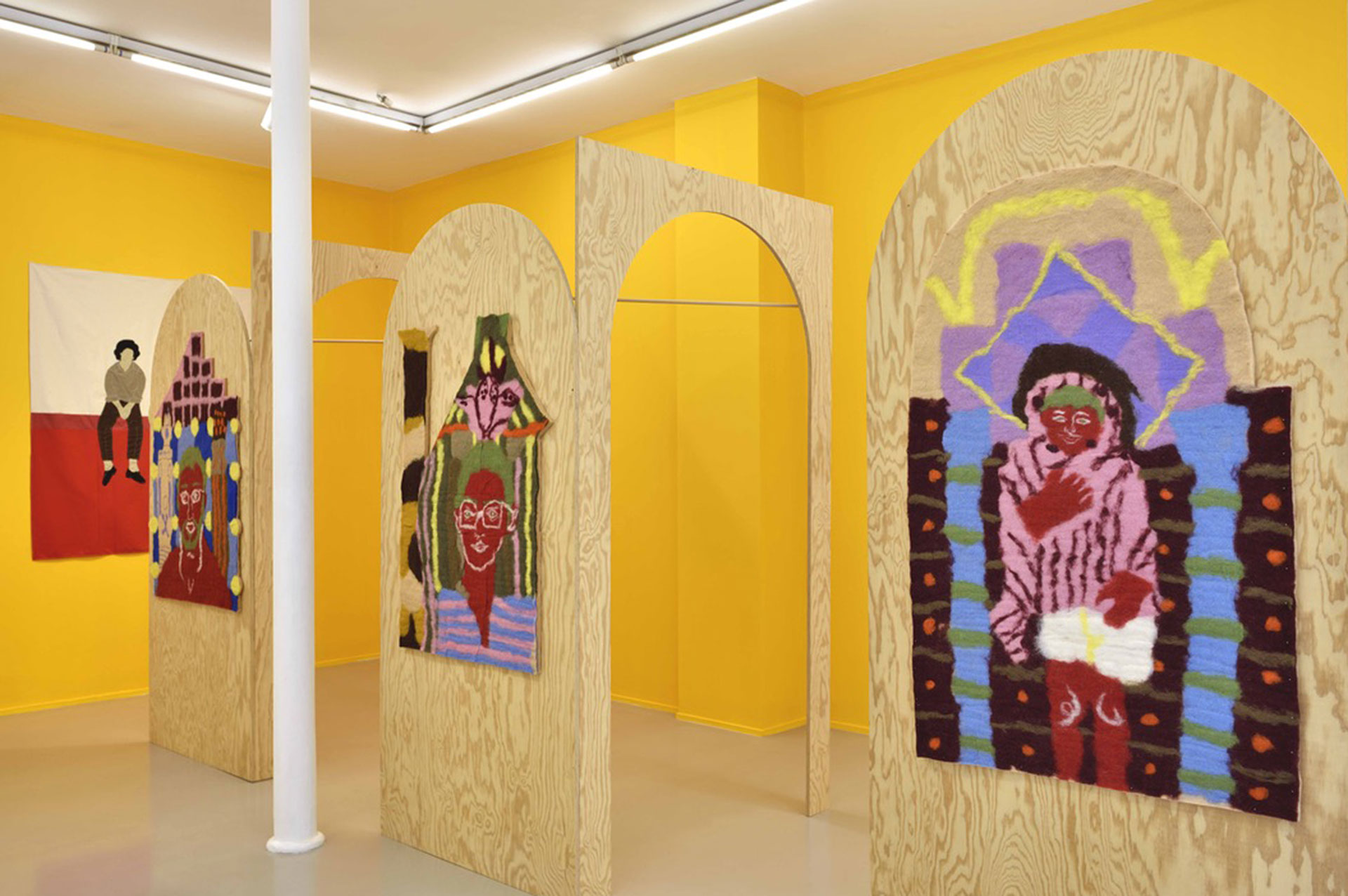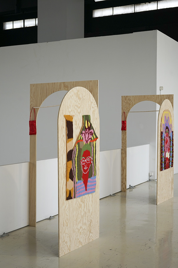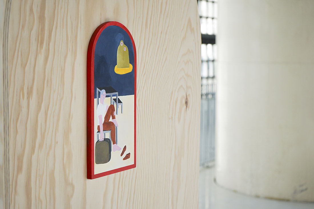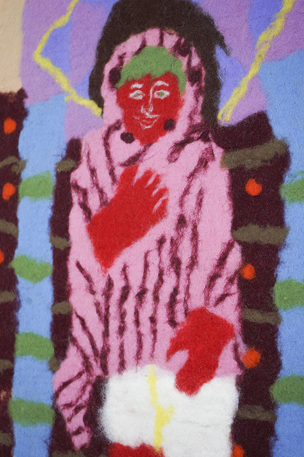 Ces pochettes sont accompagnées de petites peintures, accrochées à l’intérieur des structures, illustrant certains passages de l’enregistrement. À l’instar des fresques de la basilique Saint-François d’Assise, la narration se déploie dans l’espace et le mouvement du corps ; ici, la fresque est remplacée par le feutre, les pigments sont fixés sur un support mobile, et c’est la vie d’un profane, non celle d’un saint, qui se donne à lire et à entendre.