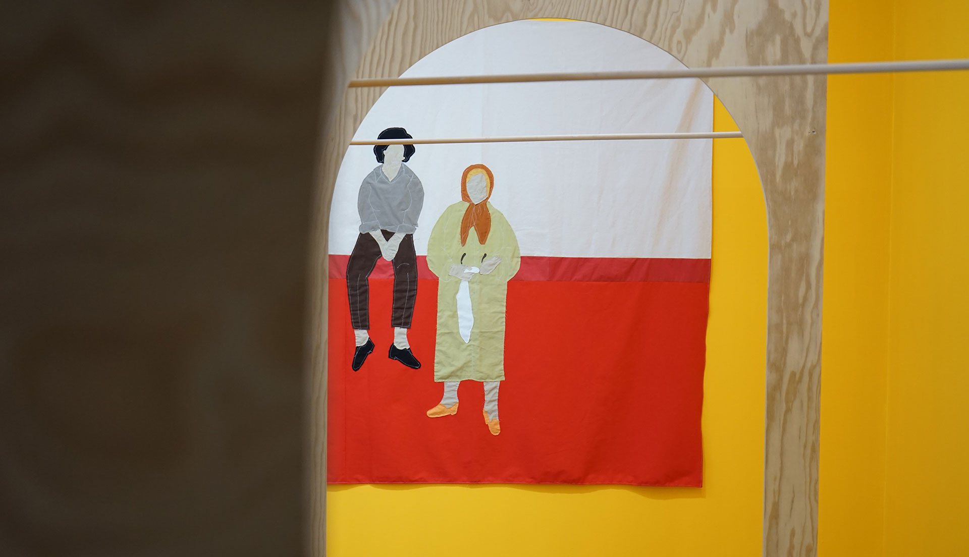 Installation composée de trois espaces en bois découpés, feutres de laine, patchworks de tissus et peintures acrylique, 100 x 240 x 120 cm