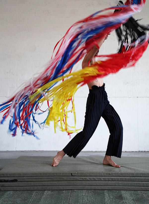 Tournée dans un squat bruxellois, elle dévoile deux corps qui se déshabillent, comme lors d’un rituel, glissant peu à peu du rôle d’interprète à celui de créature. Un poème accompagne les images, évoquant le déracinement, l’exil d’un père et la quête d’un fils pour se construire. Les silhouettes enfilent, dans une succession de plans saccadés, les huit tenues. Chaque costume semble imprimer une nouvelle chorégraphie, poursuivant une phrase gestuelle continue. Dans le travail de Darius, le mouvement naît du rapport physique entre le corps et le costume. La vidéo s’attache à montrer comment un même geste peut être perçu différemment selon le costume porté et le corps qui le porte. Ici, il ne s’agit pas de reproductibilité parfaite, mais plutôt de laisser le mouvement se contaminer, se transformer, disparaître ou onduler d’un corps à l’autre. Les corps se déshabillent encore, repassant de l’étrange au familier, revenant peu à peu à eux-mêmes. La dernière scène, comme un rêve, révèle les huit costumes en vie, semblant cohabiter dans un même espace. |