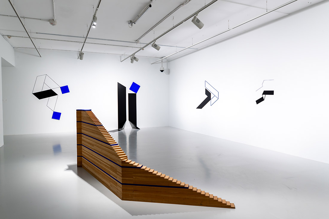 Déployée sur les murs et le sol, cette installation est très clairement dédiée au concept de l'arabesque et à son principe de continuité ; elle repose sur une trame dont le dessin se révèle et se matérialise différemment selon l'endroit où elle se développe : sur les parois latérales, avec d’un côté des séquences de fils élastiques noirs et bleus en tension, et de l’autre, des modules formés par des segments de métal et de bois naturel ; au sol, avec 72 UPN métalliques dont la cavité centrale est tantôt laissée vide, tantôt remplie de pigment en poudre bleu outremer.