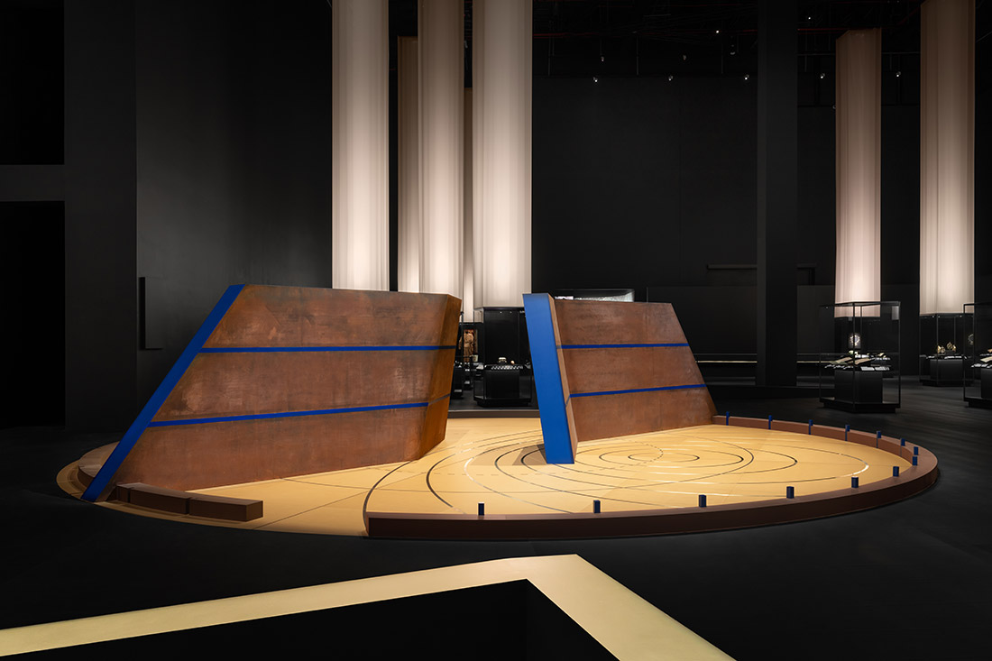 En bordure du plateau, deux bandes en relief portent des encoches correspondant à des repères de d’espace-temps : les degrés, marqués de 10 en 10 jusqu’à 180° sur chaque demi-cercle. La bande intérieure indique les heures de nuit, la bande extérieure celles du jour, scandées par des volumes bleu outremer. Au-delà de la bande intérieure, côté sud, sont gravés à titre indicatif les mois de décembre et janvier, autrement dit le cycle d’une année.