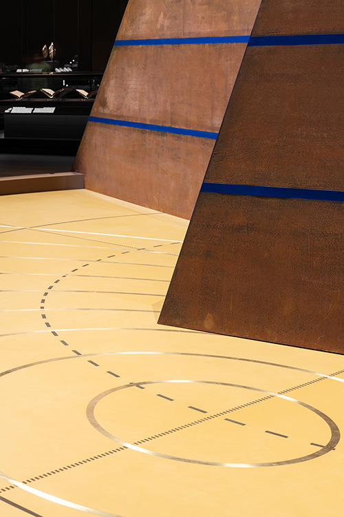 L’œuvre se présente comme un vaste espace circulaire, dont le sol porte les indications des différentes mesures géographiques : les deux lignes en pointillé qui se croisent au centre à 90° correspondent aux axes nord/sud et est/ouest ; les deux cercles noirs indiquent l’Équateur et le Tropique du Cancer, tandis que le Tropique du Capricorne est suggéré par la circonférence extérieure du plateau. Les cercles concentriques en laiton – qu’on nomme en astronomie almicantarat – permettent comme dans un vrai astrolabe de calculer pour un lieu donné, en l’occurrence ici Djeddah, les heures du jour et de la nuit.