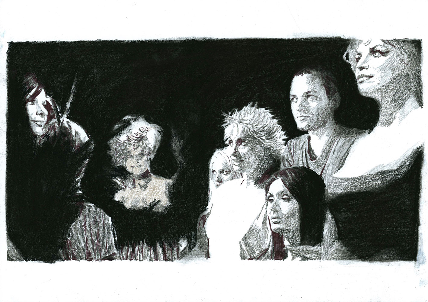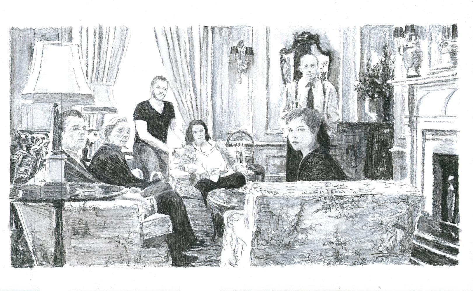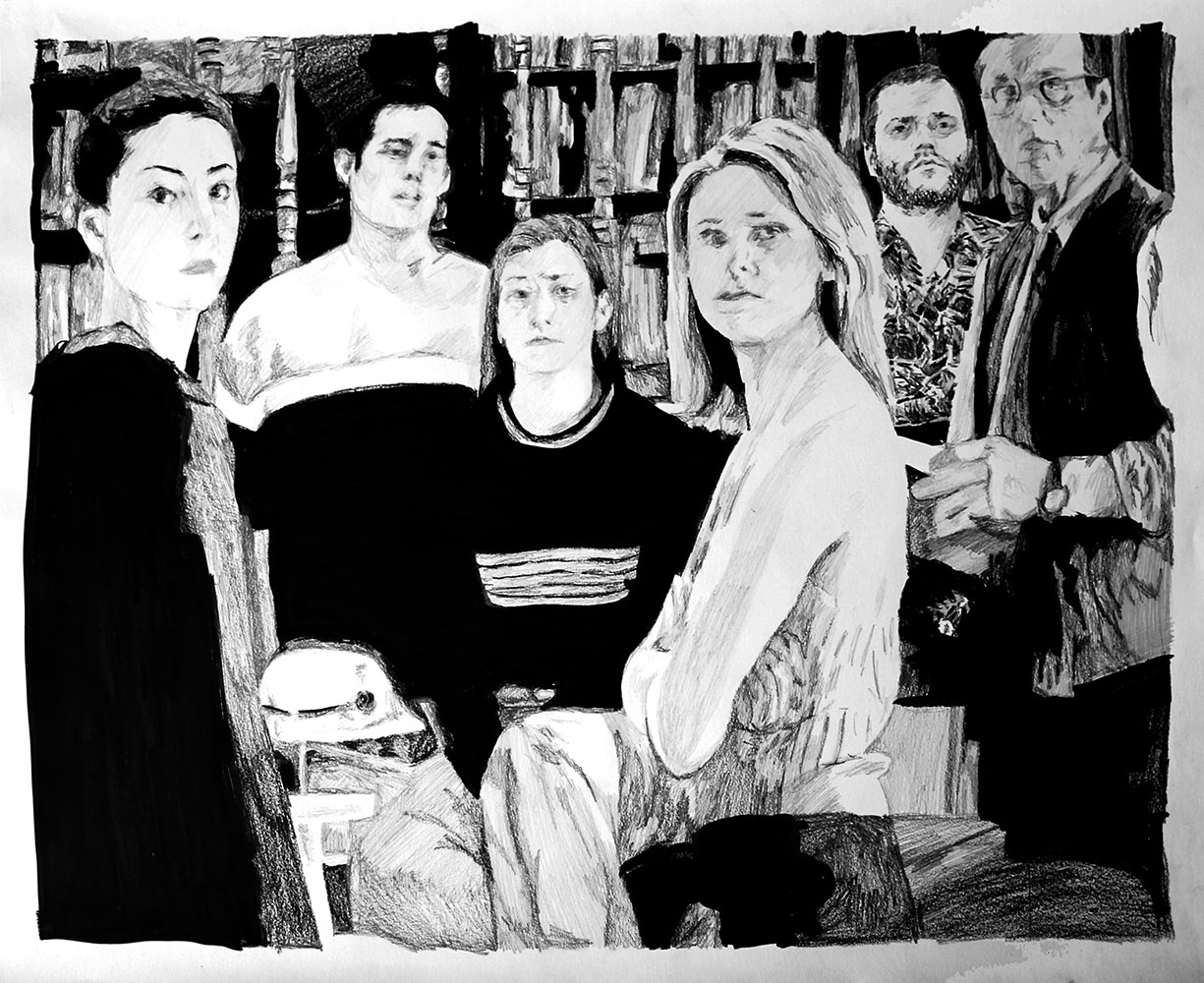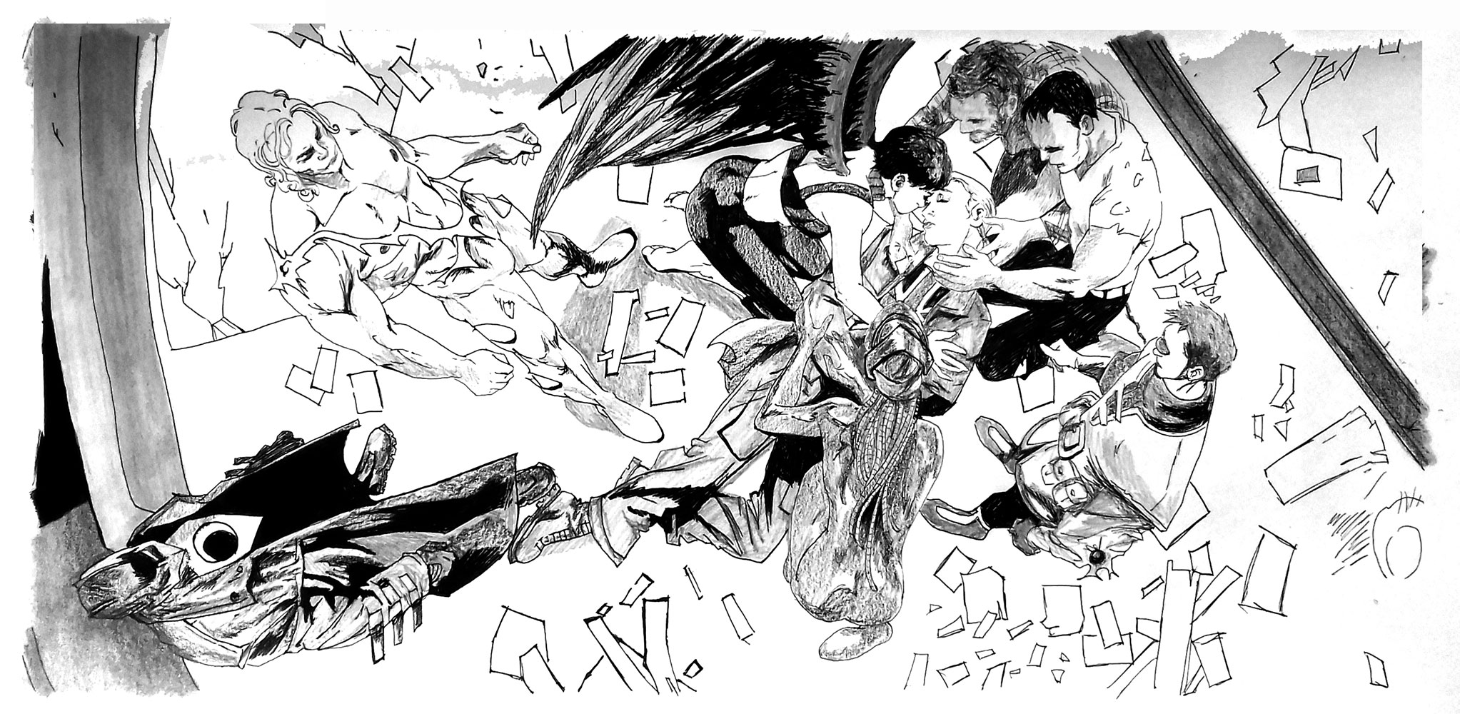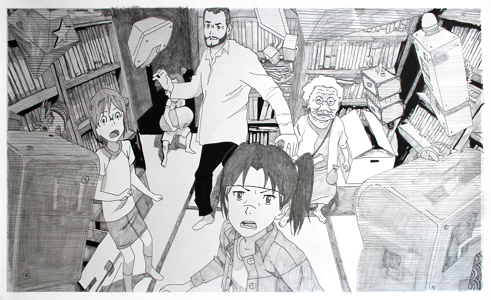 Le jeu peut s’étendre à la reconnaissance de cette figure récurrente que ma présence induit : quel est le statut de ce “type” présent dans toutes ces images de fictions sans grand lien entre elles ? Dès lors, ma fonction au sein de chaque dessin, en tant que “personne/personnage”, peut très bien être abordée comme une représentation archétypale capable de fonctionner au sein de tous genres et époques ou encore comme un individu lambda dont on interroge le processus d’identification. Je peux, dès lors, potentiellement servir de réceptacle à la projection du spectateur, invitant à une certaine mise en abîme : une projection dans une projection.