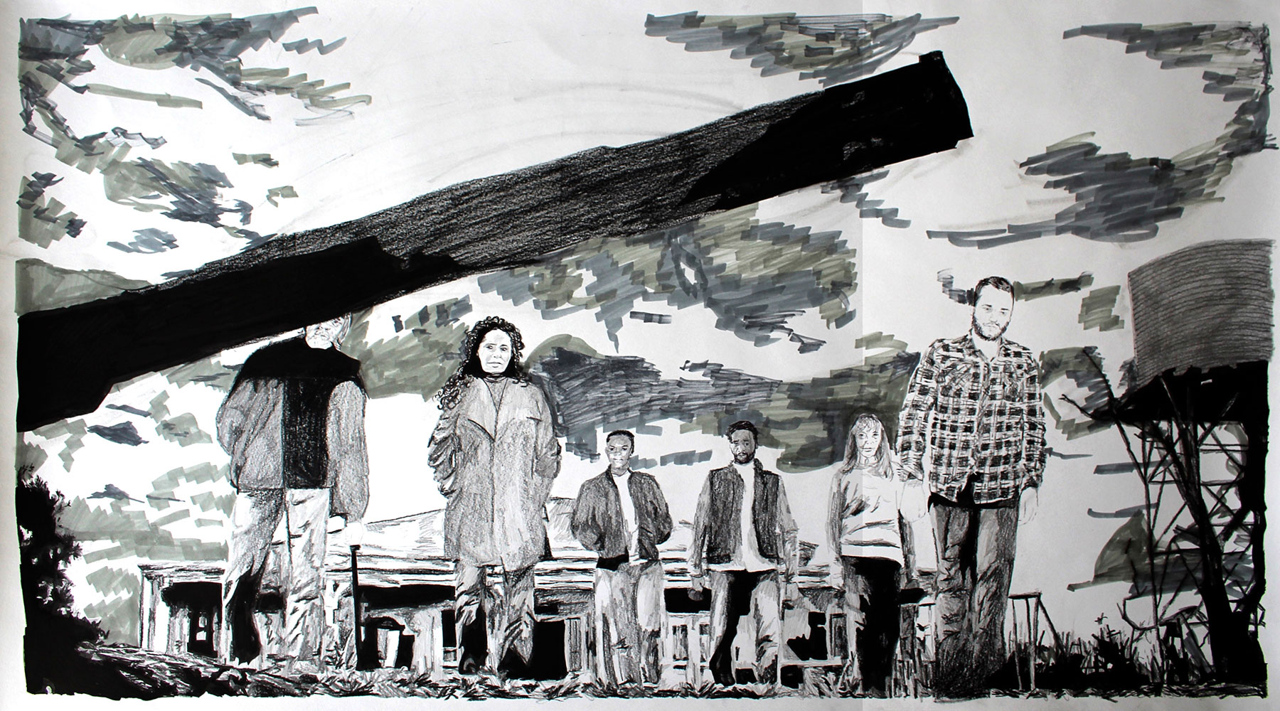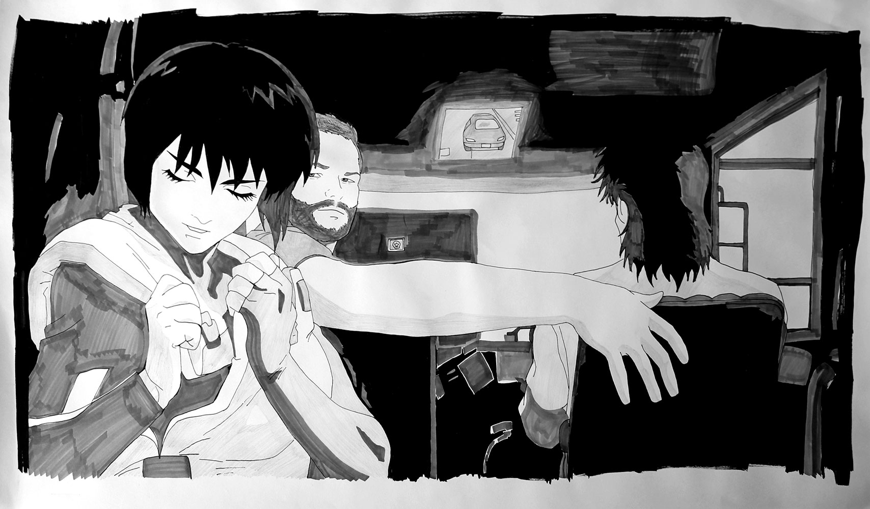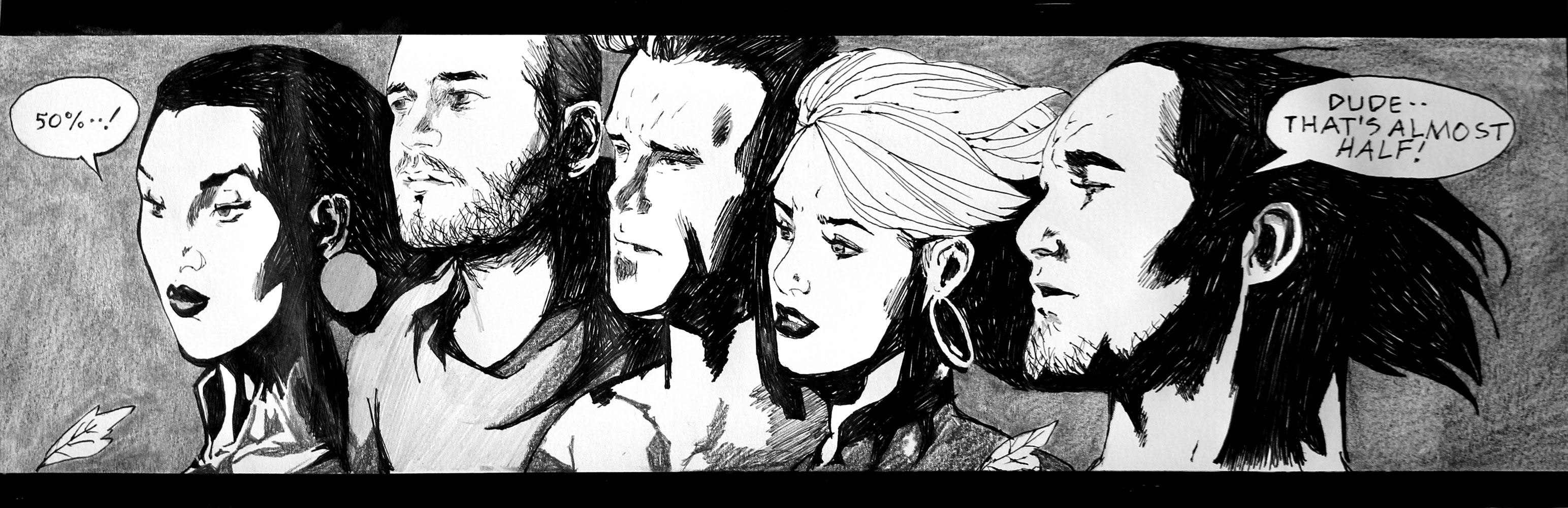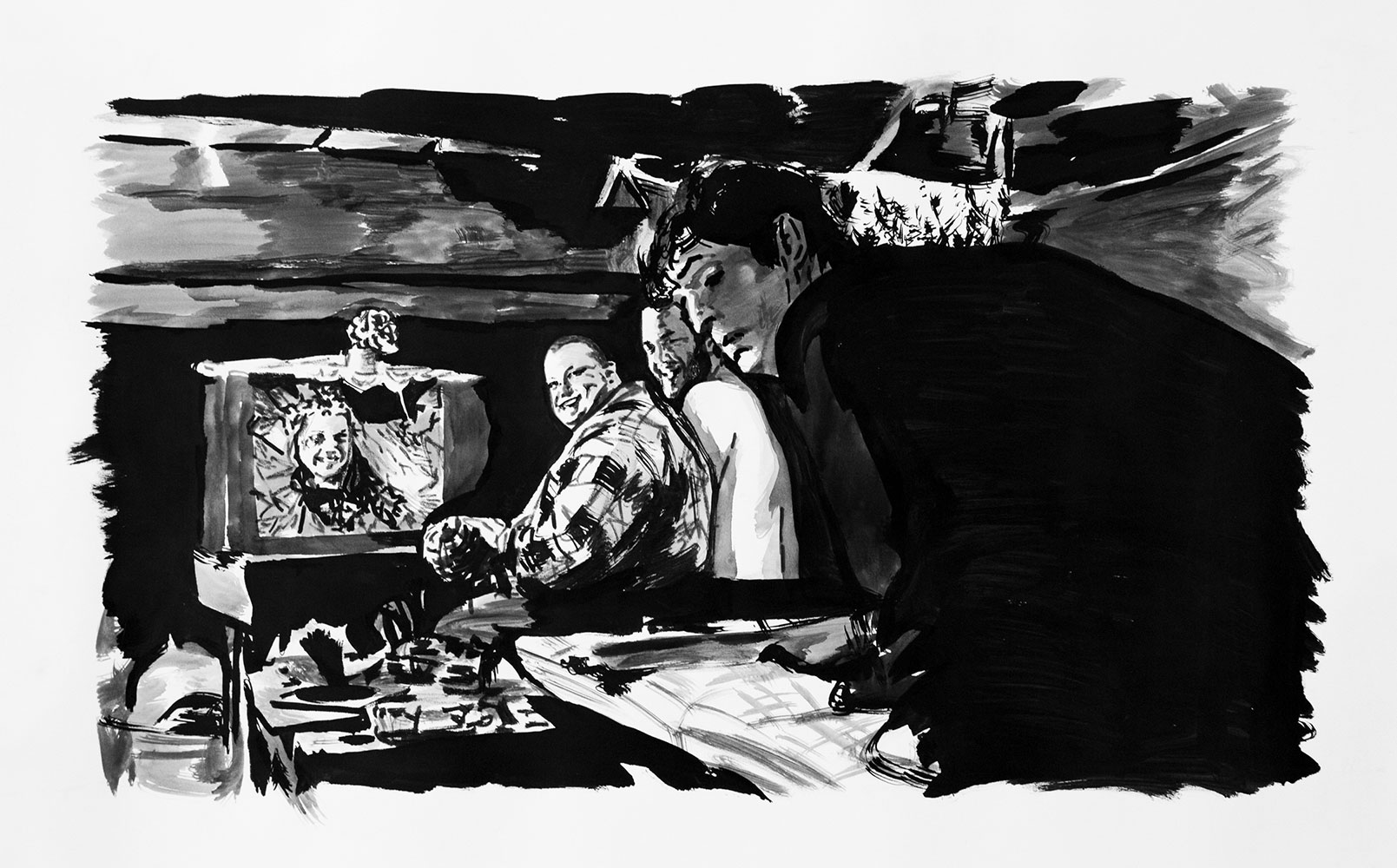 Le jeu peut s’étendre à la reconnaissance de cette figure récurrente que ma présence induit : quel est le statut de ce “type” présent dans toutes ces images de fictions sans grand lien entre elles ? Dès lors, ma fonction au sein de chaque dessin, en tant que “personne/personnage”, peut très bien être abordée comme une représentation archétypale capable de fonctionner au sein de tous genres et époques ou encore comme un individu lambda dont on interroge le processus d’identification. Je peux, dès lors, potentiellement servir de réceptacle à la projection du spectateur, invitant à une certaine mise en abîme : une projection dans une projection.