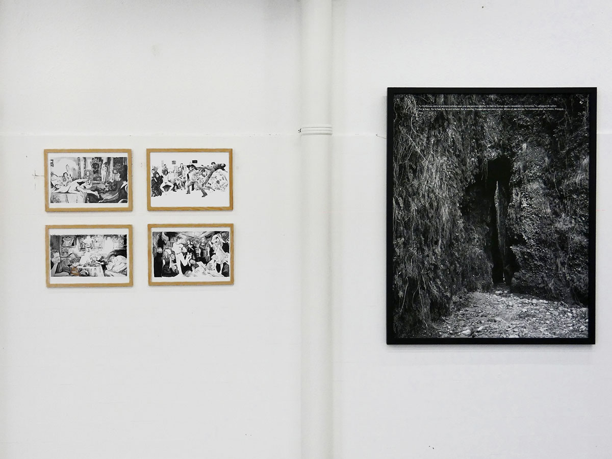 Ces scènes contiennent autant d’éléments pouvant provoquer des “déjà-vu” que de contenus autres, plus personnels. Les visuels identifiables sont aussi bien puisés dans l’histoire de l’art (peinture, photo etc) que dans la BD, le cinéma, les séries/animes, Internet etc... L’ambiguïté de ces différents éléments ainsi mis en présence instaure un trouble, une certaine perte de contrôle. Se raccrocher à sa culture, sa (re)connaissance du visuel, c’est prendre le risque de se couper de son nouvel environnement narratif. L’histoire, même quand on pense la connaître, échappe toujours en partie dans la multiplicité narrative que lui confère son nouvel environnement, où le regard peut circuler dans l’espace de la feuille et y découvrir de nouveauxéléments pouvant, parfois, emmener vers d’autres niveaux de lectures voire d’autres narrations. Un dialogue entre le conscient et l’inconscient, une mise en forme de ce qui a pu émerger. Le dessin comme un écrin au pulsionnel et la narration comme un détournement du libidinal. La frontalité peut déranger mais la mise en relation non hiérarchisée des genres, des sexualités interpelle.