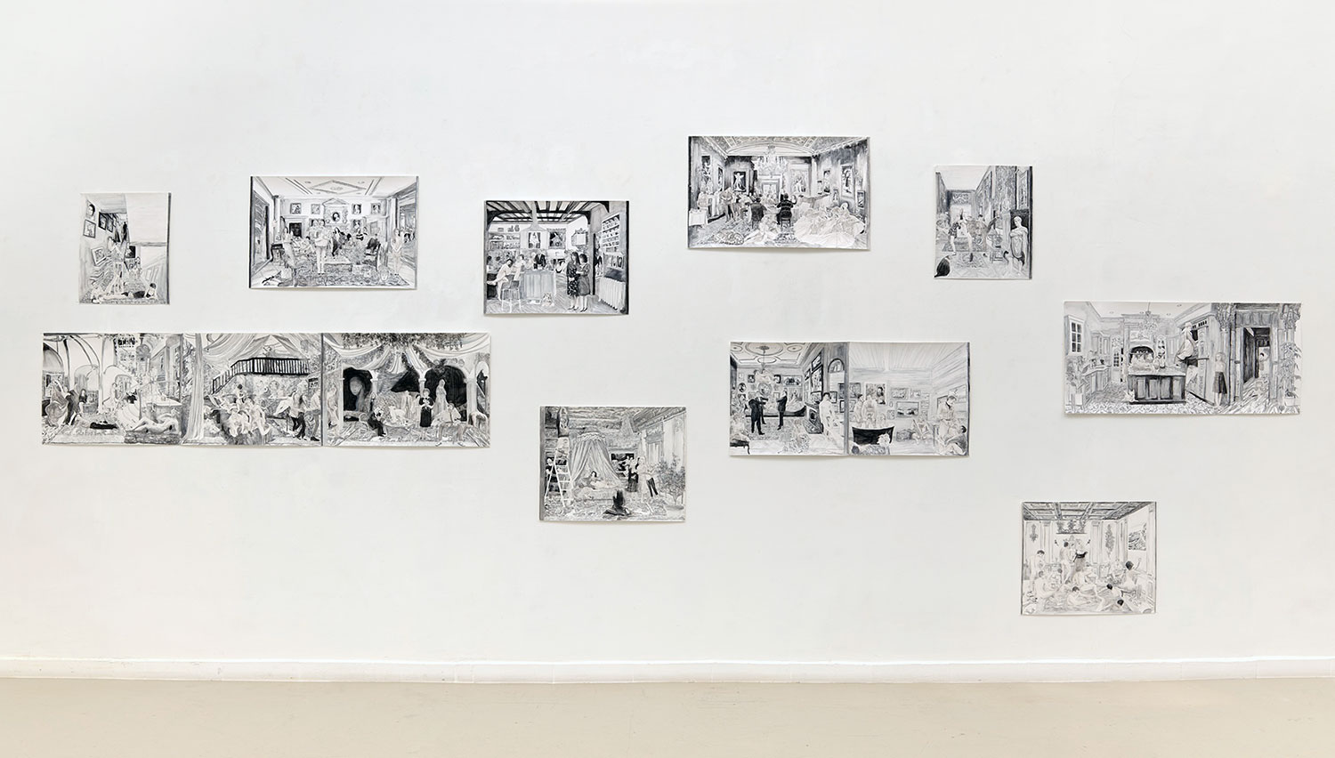 (...) Une immense habitation où l’on se retrouve curieusement voyeur, seul dans la nuit à épier ce qui se passe dans la maison d’en face. Chaque dessin en représente une pièce, les décors sont cossus, les murs couverts de tableaux, les tapis moelleux épaississent le silence, les meubles riches et confortables accueillent les personnages d’apparence ravis de leur situation. La maison comme espace protecteur, sécurisant… voire oppressant. Le cinéma a fait place au théâtre. Chacun joue son rôle, rôle de naissance ou de composition. Tout parait joué d’avance, le statut définit la liberté d’être soi. Quelques scènes explicites, la sexualité comme pulsion de vie, viennent élargir le champ des possibles, voire exploser le jeu préétabli, mettant à mal les valeurs protectrices et éducatrices du cocon familial souvent trop réductrices. Domination, oppression, frustration, morale ou simples jeux libérateurs ?… Elles nous ramènent au Théâtre de la cruauté d’Antonin Artaud qu’il définissait lui-même comme devant être un lieu de confrontation, de choc et de révélation, où les spectateurs sont plongés au cœur de l’action et confrontés à leurs propres instincts et pulsions. La cruauté ne doit pas être comprise dans son sens habituel de violence gratuite, mais plutôt comme une force libératrice et transformatrice. Derrière « cruauté » il faut entendre « souffrance d’exister » et non une cruauté envers autrui. (...) En cette époque trouble et très incertaine, l’atmosphère environnante parait bien asphyxiante, les relations virtuelles transformant le quotidien en artifices de survie. Résister, exister, se priver, profiter, s’interdire, jouir, pas de plaidoyers politiques, d’idéologie sexuelle. Juste, éclairer l’invisible. Maxime Parodi donne à ses dessins ce rôle semblable à la catharsis. La nuit, sa période du jour favorite pour travailler, déroule ses vengeances sous nos regards médusés en retardant l’heure de l’ultime solitude. Qu’importe le consensus, l’art cultive sa mission première de lutter contre l’obscurantisme.