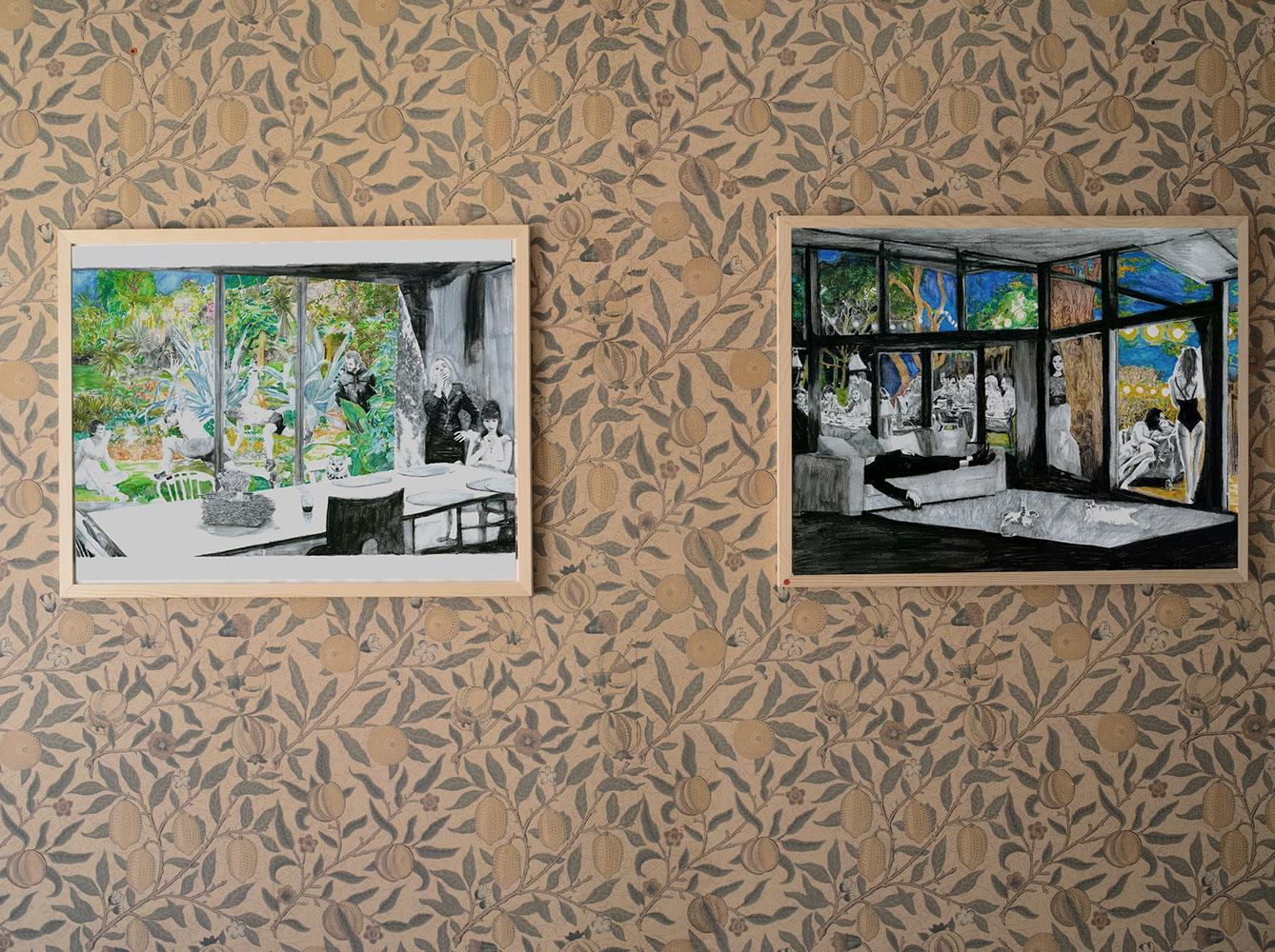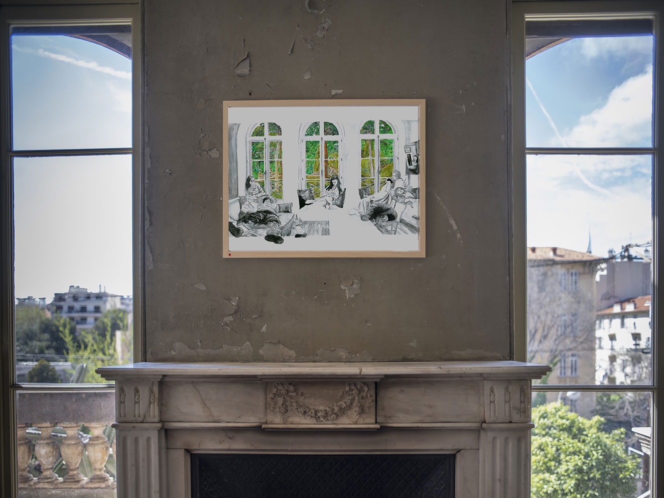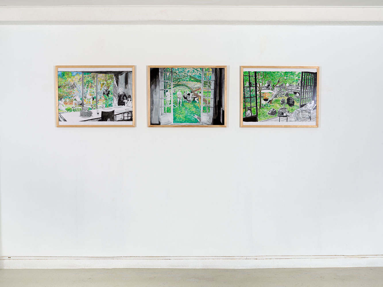 À travers l’utilisation délibérée du noir et blanc pour les intérieurs en contraste avec les couleurs pour le jardin, Fenêtre(s) sur jardin cherche à mettre en lumière le véritable sujet de ces dessins, invitant les spectateurs à réfléchir à leur propre relation avec les environnements jouxtant leur lieu de vie, entretenus ou non, accessibles ou simplement observés, fermés ou supposément ouverts mais toujours désirés comme tels par une volonté et intervention humaine. |
