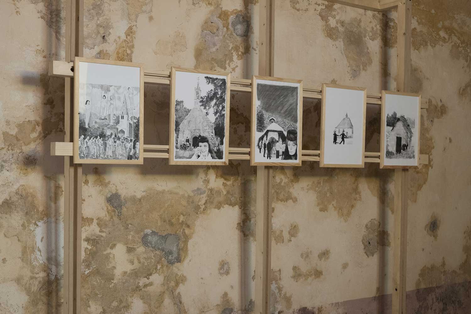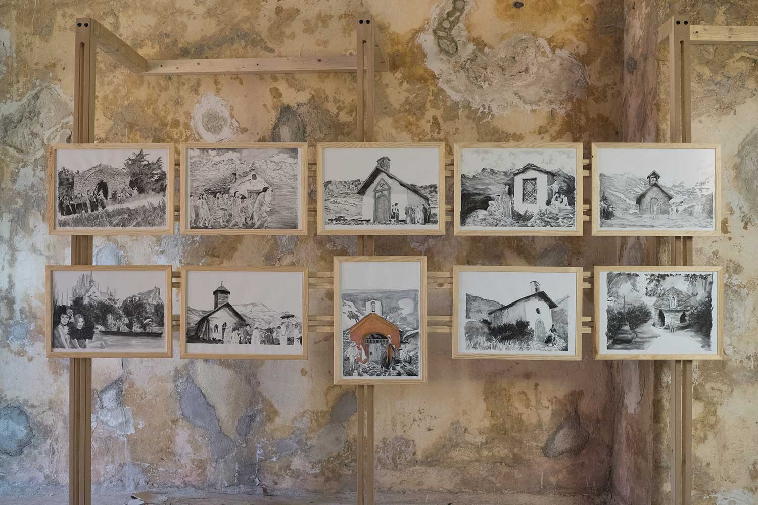 C’est par cette indication de lieu que s’ouvre la scène page 113* du script Le Voyage de G. Mastorna de Federico Fellini à laquelle cette série de chapelles vient faire écho. Ce scénario jamais porté à l’écran a donné lieu en 2015 à un projet d’exposition Manifestement sans fin, monté collectivement Le projet était d’insuffler à cette œuvre l’existence plastique qu’elle n’avait jamais eu jusqu’alors (si ce n’est une amorce dans une bande dessinée - elle aussi avortée - de Manara). Chacun de nous a eu le loisir de donner sa vision du matériau source ou encore d’y apporter sa subjectivité. Au regard des dessins présentés en 2015, Les chapelles voisines donne lieu à un changement de format et de technique. Pour emprunter au champ cinématographique auquel ce voyage aurait dû appartenir, on peut désigner ce travail comme un remake d’une partie de ma production réalisée pour Manifestement sans fin. De nouvelles chapelles sont venues s’ajouter, tels des plans inédits de cette déambulation mélancolique.