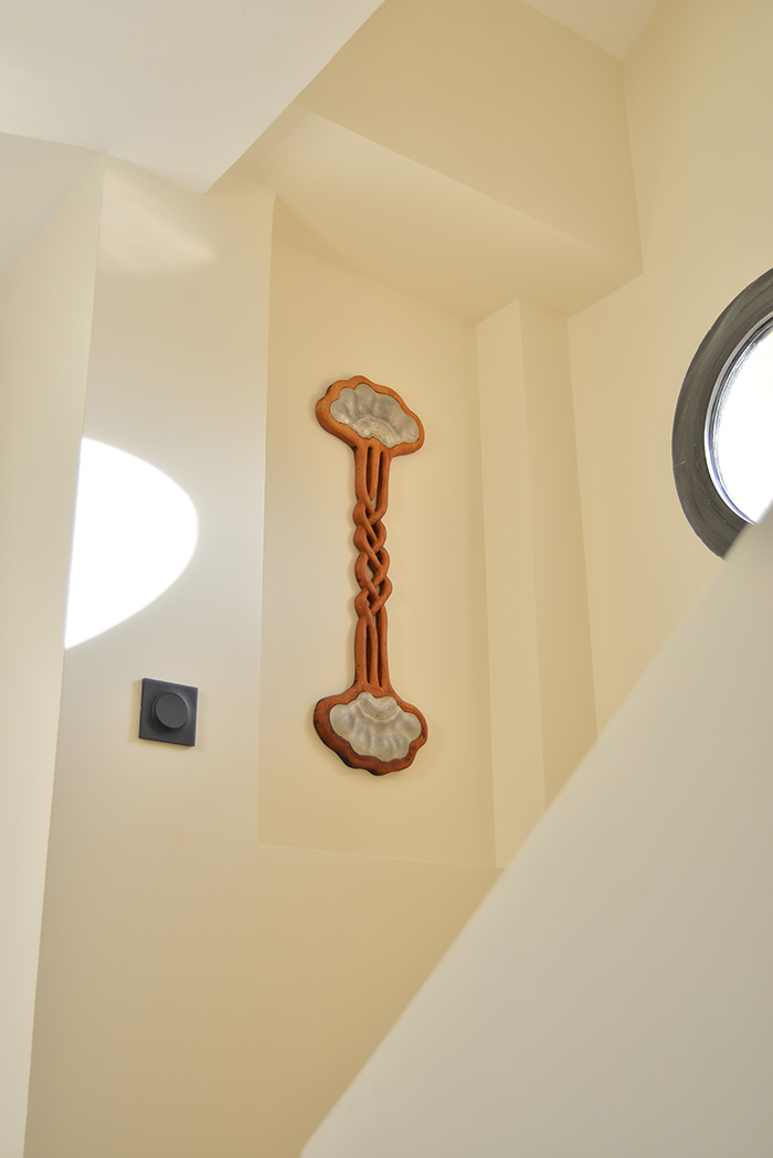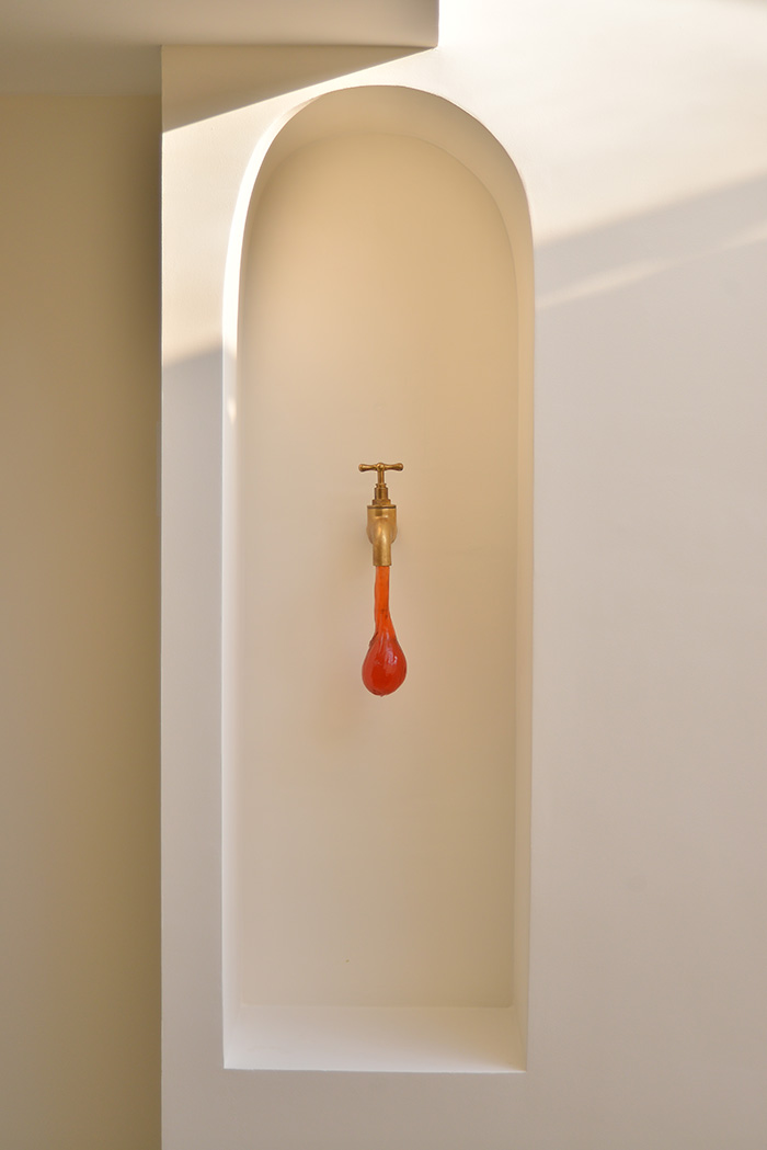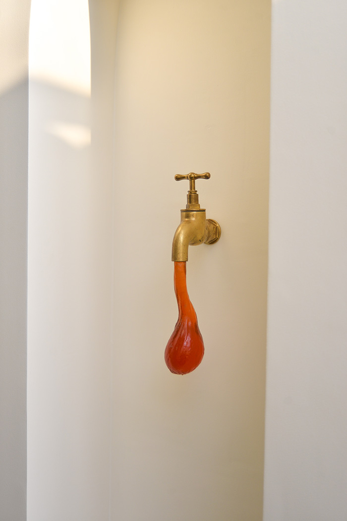 « Anastasia Simonin & Kazuo Marsden imaginent pour leur part des icônes totémiques à l’effigie des flux impalpables qui font vivre les lieux. Ampoules, robinets et prises électriques sont ainsi célébrés comme autant de fluides aquatiques et électriques traversant les murs de la maison. »