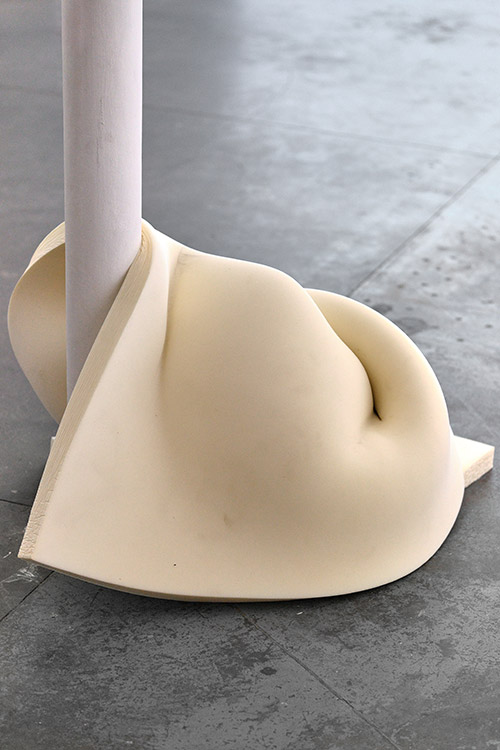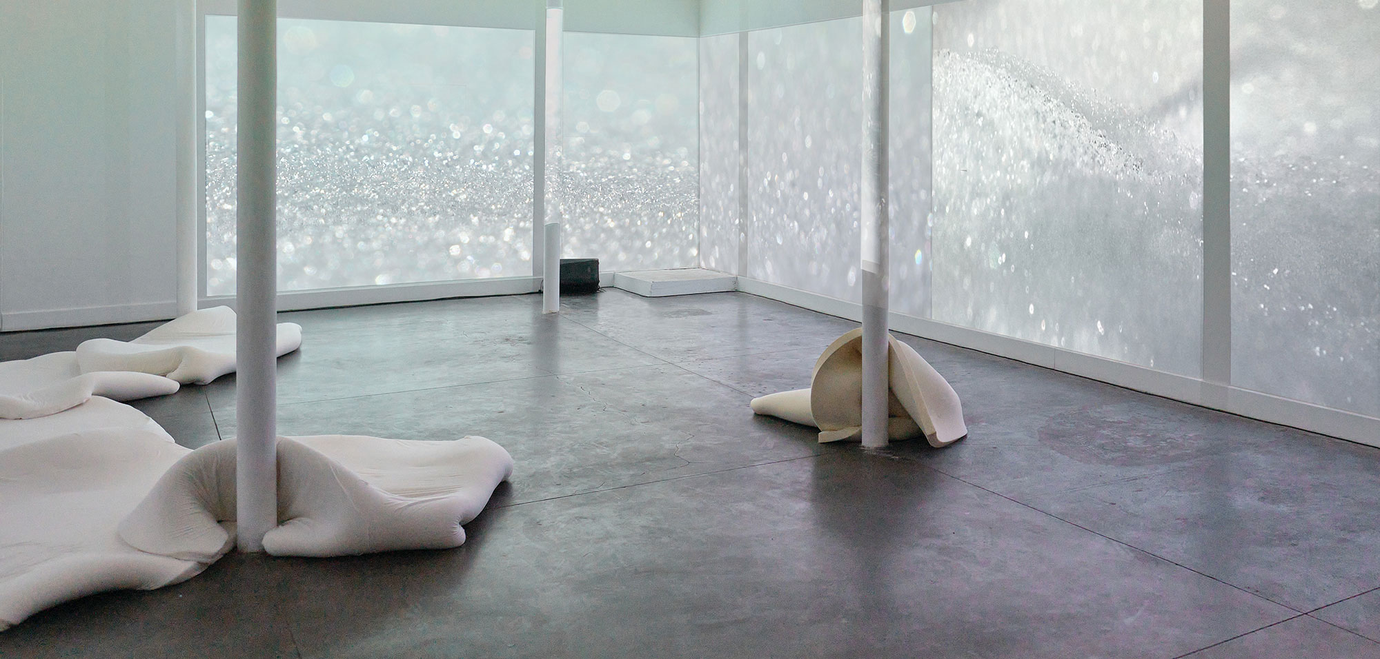 J’invite les spectateurices à se déchausser avant de rentrer dans l’installation pour mieux profiter de l’expérience haptique. Ce paysage est habité par sept sculptures en matelas mémoire de forme de 160x200cm où les corps des spectateurices peuvent les manipuler et s’y déposer pour écouter, regarder, sentir et toucher cette matière spécifique qui reprend forme instantanément en écho aux sensations haptiques de neige.