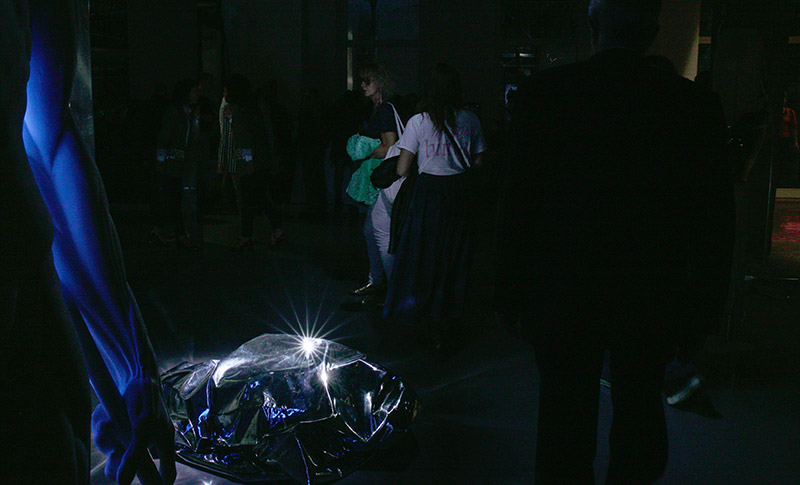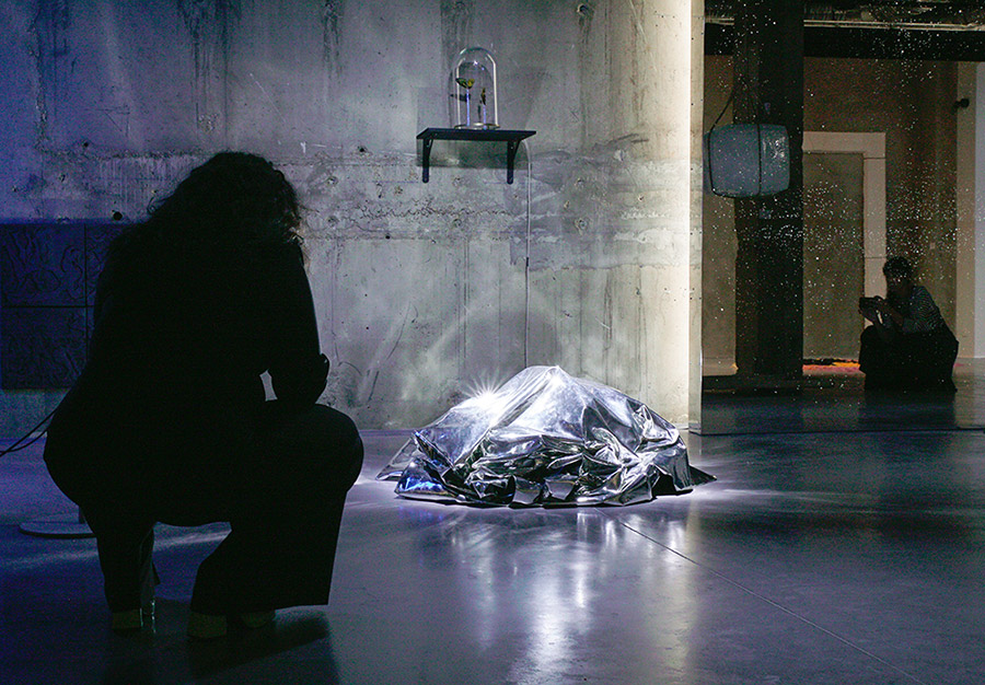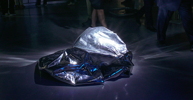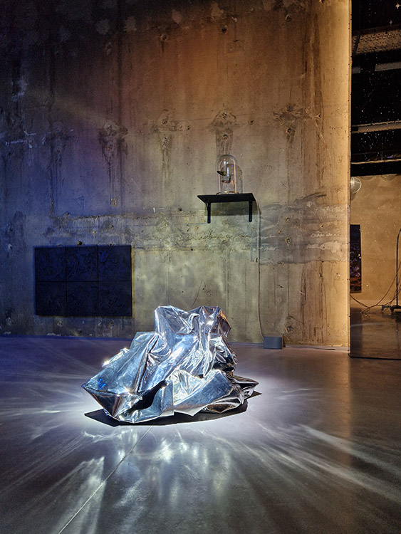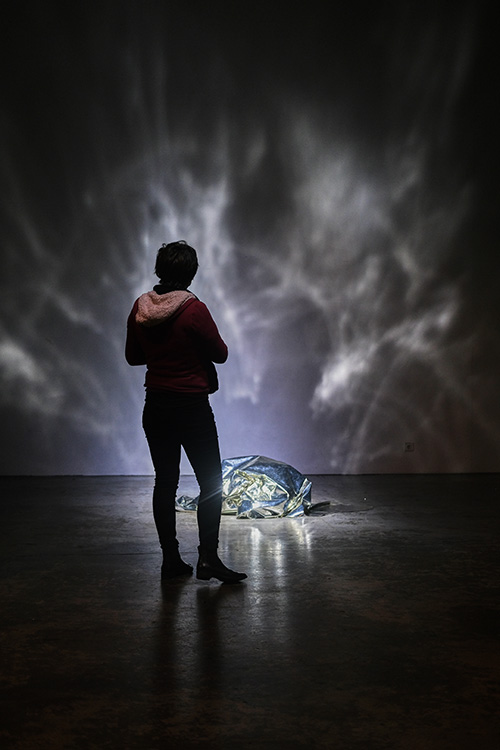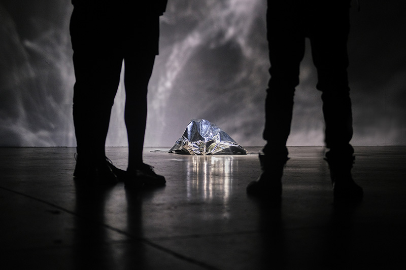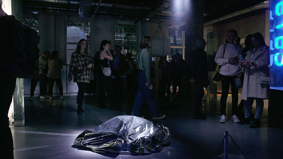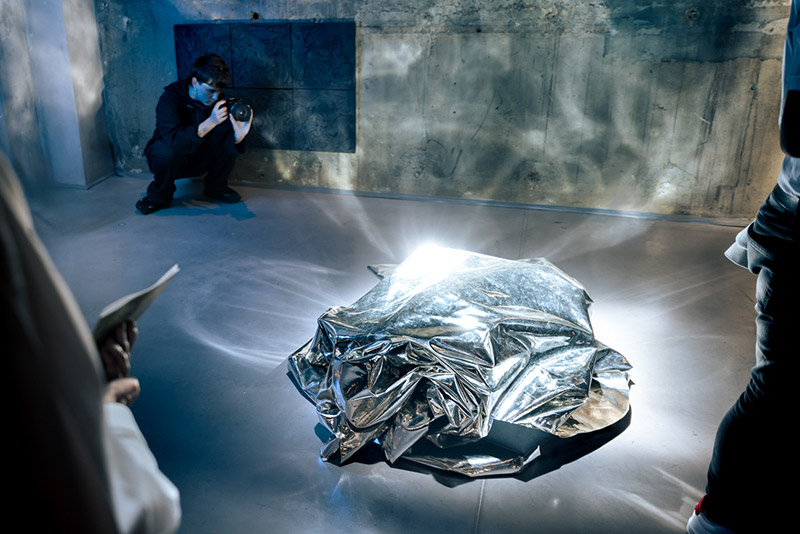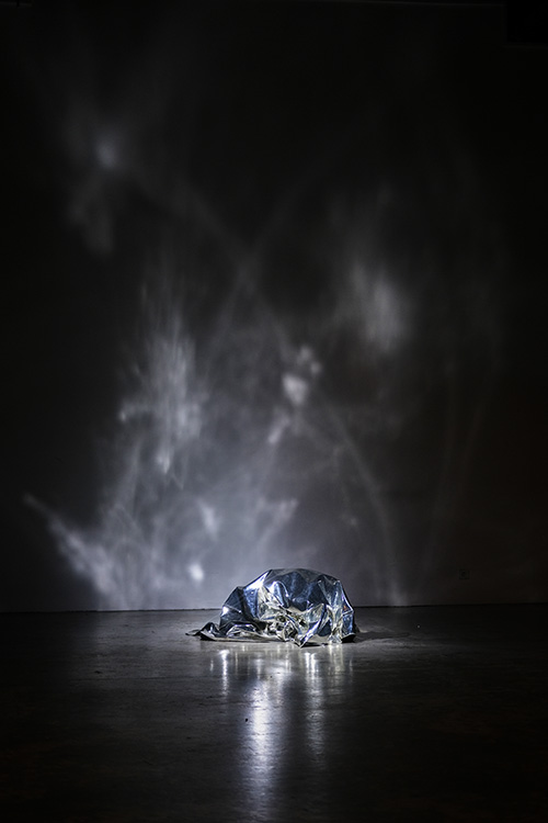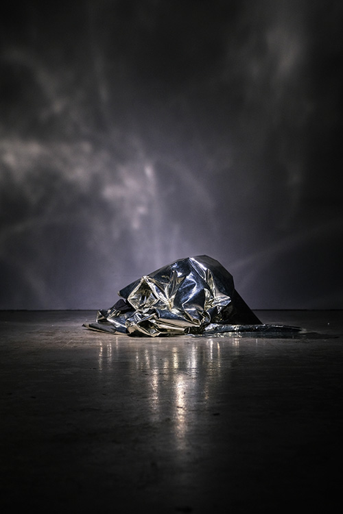 • « Plus loin, même hallucination : cette fois-ci c’est un grand morceau de papier aluminium, posé à même le sol dans le passage – pas à l’abri de se faire trouer par la pointe d’un talon. Le tissu argenté, qui pourrait aussi s’apparenter à une couverture de survie, gonfle et dégonfle, comme si quelqu’un respirait en dessous. Est-ce le cas ? Sculpture vivante ? Vivant sculptural ? »