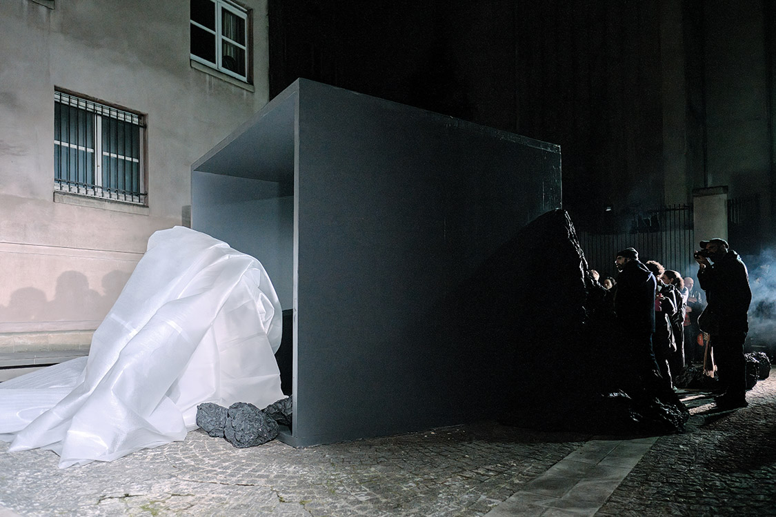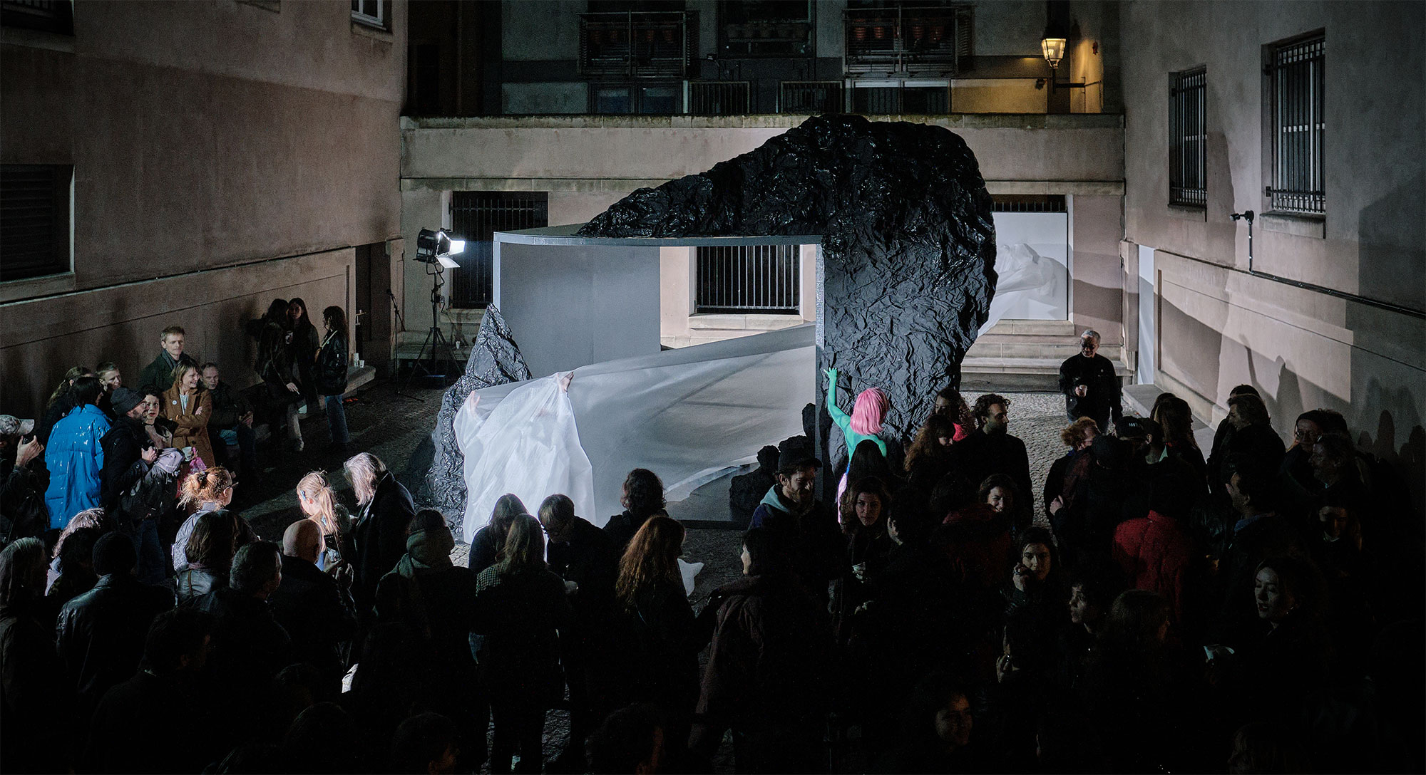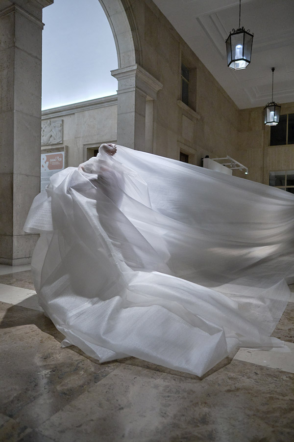La sculpture vivante s’élève et alterne entre tension et relâchement. Elle envahit l’espace lentement en se dépliant. Elle créer une nouvelle architecture en modifiant le déplacement des spectateurices dans l’espace.