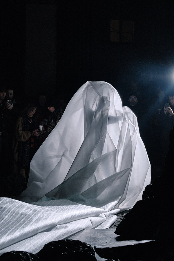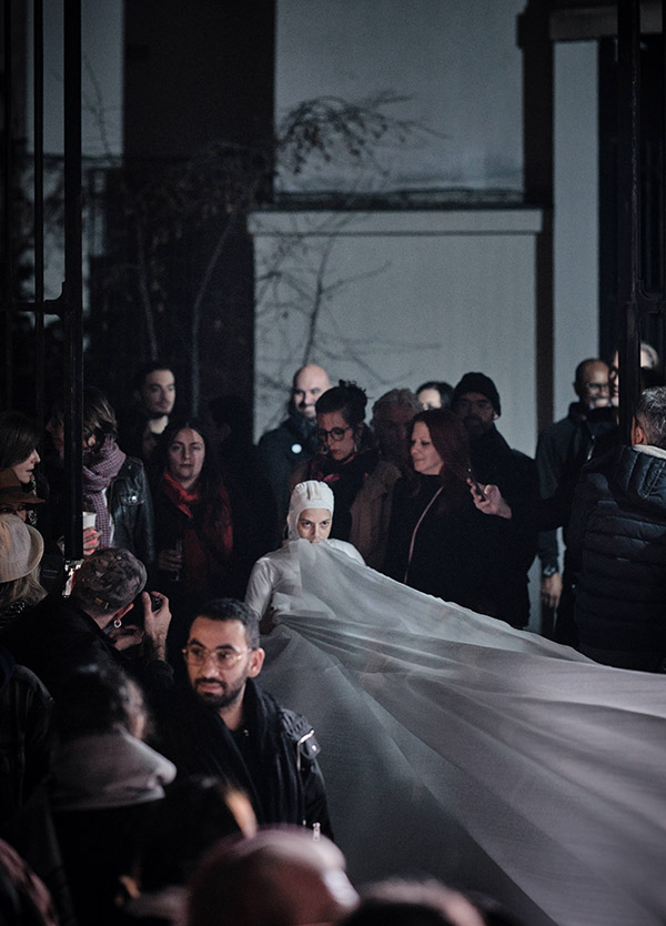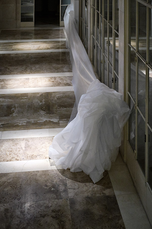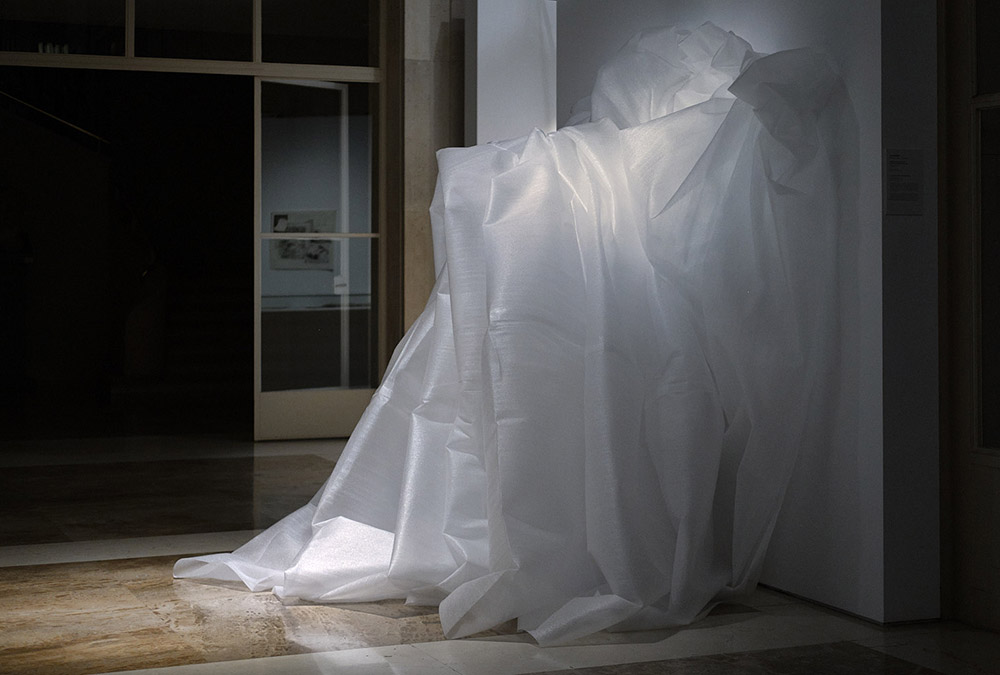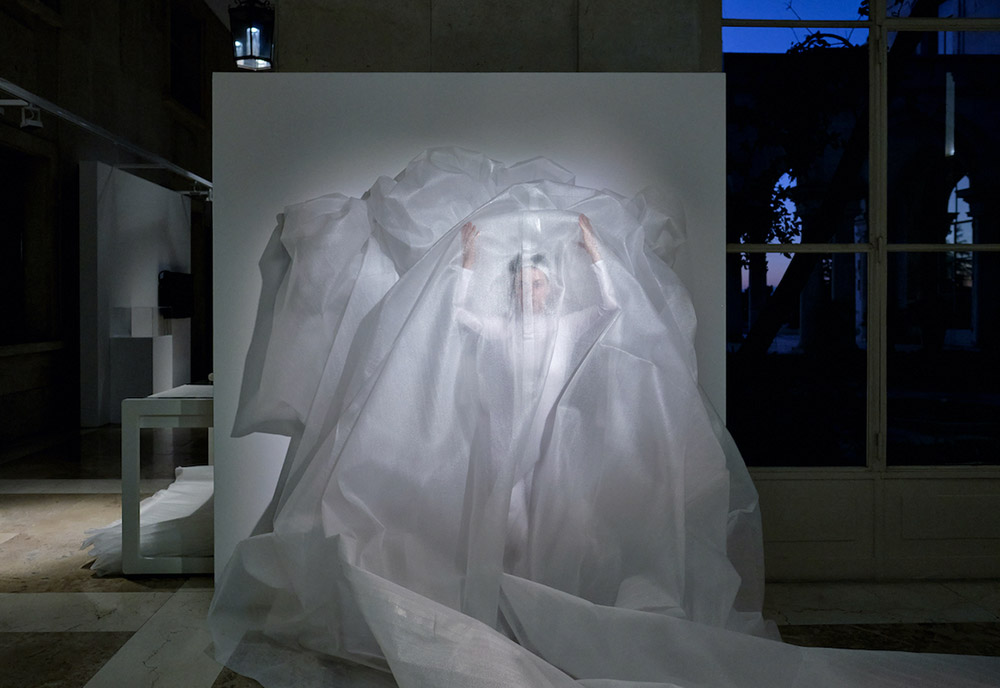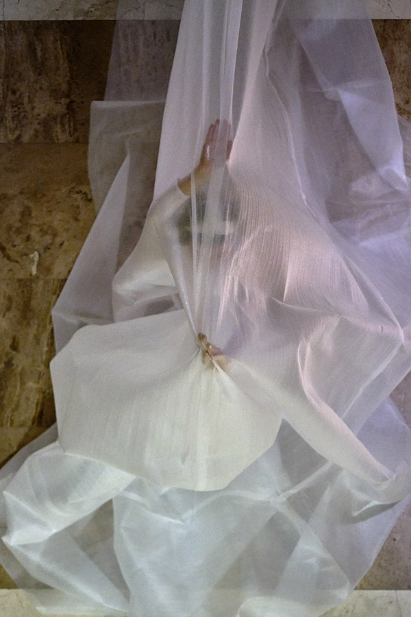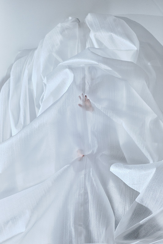 « Les matins transparents qui dansent » est une pièce entre performance et sculpture. Un corps enveloppé d’un film de mousse* s’étend sur 25 mètres [ajuster en fonction de l’espace d’exposition]. Cette matière blanche et transparente qui reflète la lumière lui donne l’apparence de la neige.