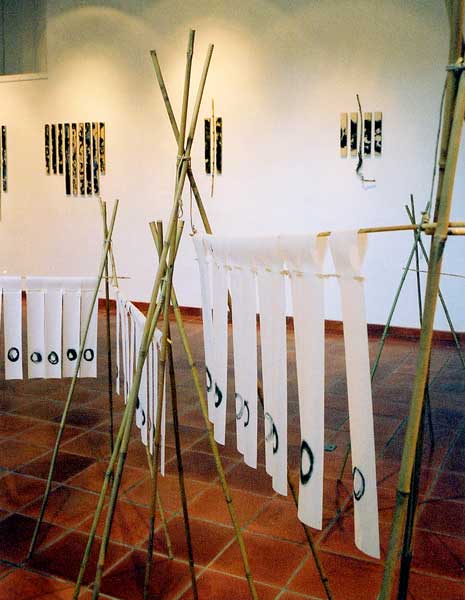 Au premier plan : bambous, papier chinois, encre, cordelettes