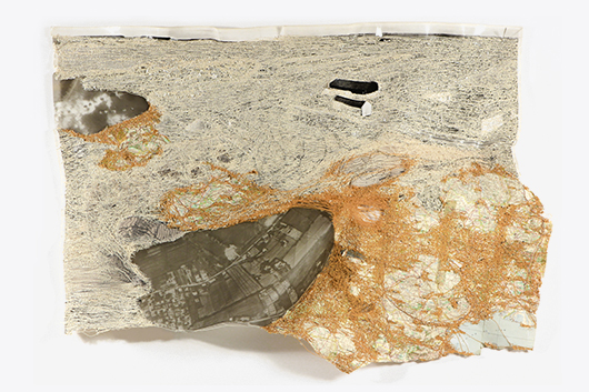 Par l’effacement des données initiales, on contemple le résultat d’un cataclysme sans nom, qui évoque les pires prospectives écologistes. Des matières submergent les cartes, les sols sont couverts de fils ; déchirées, dépecées, trouées, les cartes ont changé de bord, elles ont versé du côté de l’innommable. Parfois, une maison surgit de ces décombres, de cette coulée dévastatrice, un havre de paix lové au cœur de la matière cotonneuse. À un autre moment, deux cheminées de centrales nucléaires s’élèvent dans une marée de fils roux et leur fumée nocive envahit tout l’espace supérieur. Notre planète n’est-elle pas ce monstre marqué par les cicatrices des guerres, les conflits, les chantiers humains qui la détruisent, mais aussi par les processus incontrôlables de l’énergie vitale à l’œuvre dans les rémissions, les adaptations, les hybridations et les régénérations consécutives ?