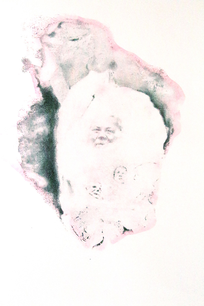 Ces « au-delà de la forme » comme le grec les définit, sont d’une nature indéterminée et jaillissent du médium en état de transe. Un certain nombre de photographies (d’époque), glanées sur internet, en témoigne. A l’évidence photo-montées, ces images mettent en lumière les combines du médium-prestidigitateur pris la main dans le sac. Elles deviennent ici le prétexte à une série de dessins par transfert. Les papiers frottés à l’acétone gardent la trace nébuleuse de ces émanations (spirites). La technique même fait écho au processus psychanalytique permettant la réactualisation des conflits psychiques mais aussi à l’adhésion spirituelle et charnelle que toute croyance nécessite. |
