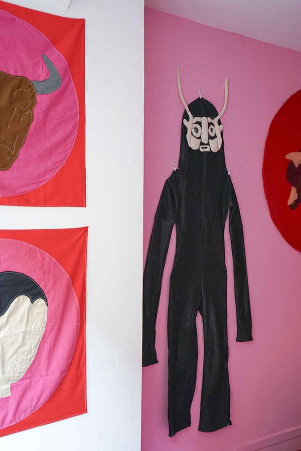 | Le décor de la chambre est le personnage principal. Ses couleurs évoquent le matador et ses atours colorés : le rouge de sa muleta (cape), le rose de ses medias (chaussettes) et le noir de sa montera (toque). L’ensemble met en scène une forme exacerbée de la masculinité, fantasmée et fétichisée. |