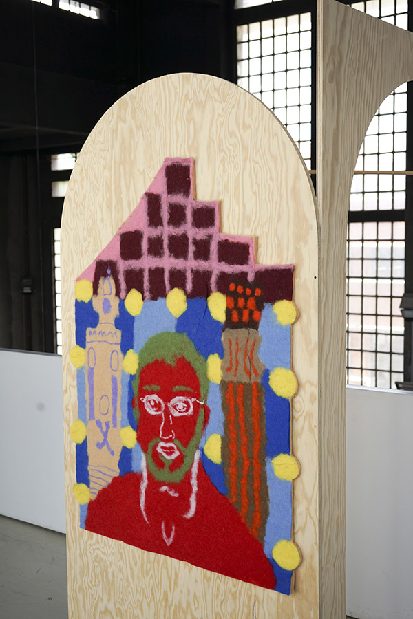 | Chacune de ces voûtes abrite, sur sa face extérieure, un feutre de laine. Ce feutre a été conçu à partir d’images d’archives représentant le père de l’artiste durant son enfance en Iran, peu avant son départ pour la France, puis plus tard, une fois installé. À ces images s’ajoute une pochette brodée renfermant une enceinte discrète, d’où s’échappe un témoignage audio : la voix du père y raconte sa vie avant l’exil, son intégration, puis sa désintégration progressive en terre étrangère. |