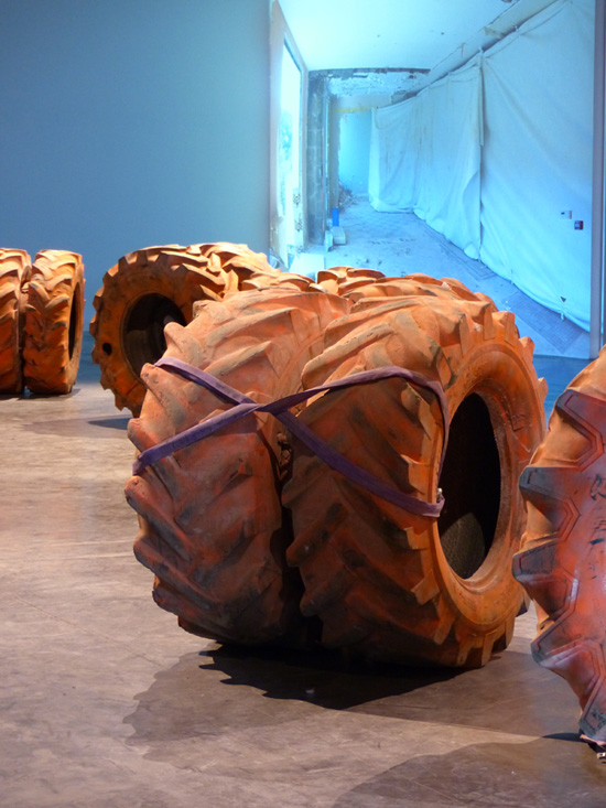 Pneus, peinture de chantier, acier, caméras Go-Pro, enregistreurs son, dimensions variables