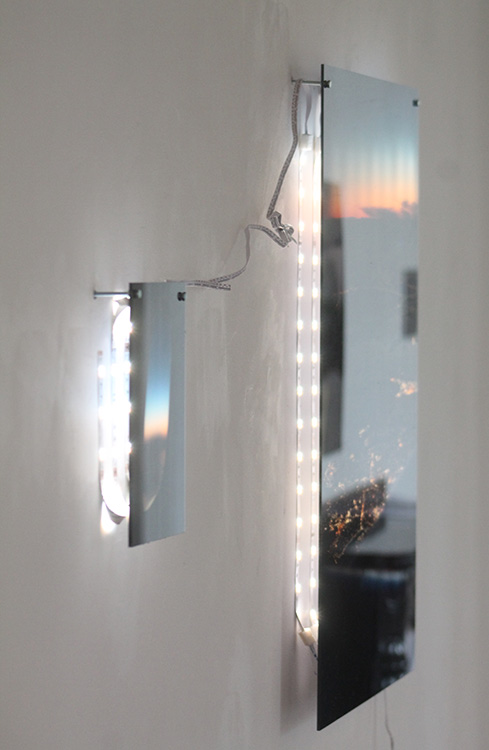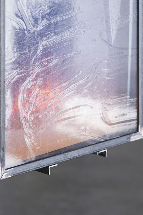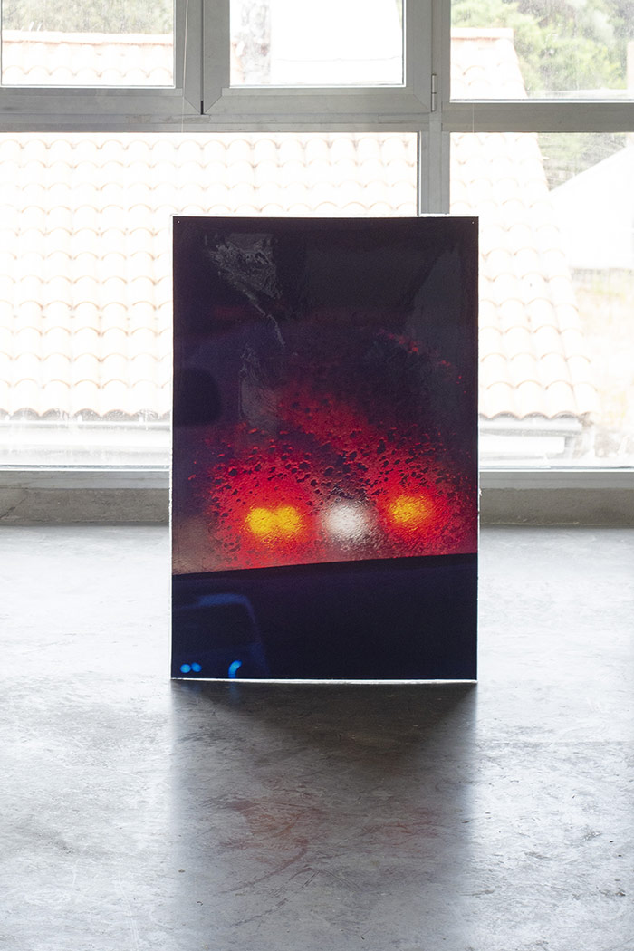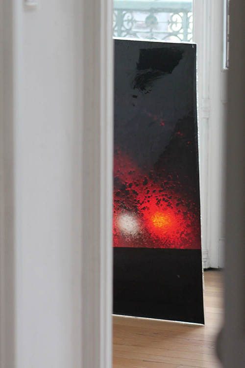 Les installations et photo-objets jouent ici de la lumière comme d’une matière, au contact des matériaux qui l’impliquent directement dans l’expérience que l’on peut en faire : verre bullé ou résine coulée, dont les aspérités multiplient volontairement les reflets, donnant une impression liquide ; supports translucides ou microperforés qui laissent filtrer la lumière, naturelle comme artificielle, qui les rétro-éclaire.