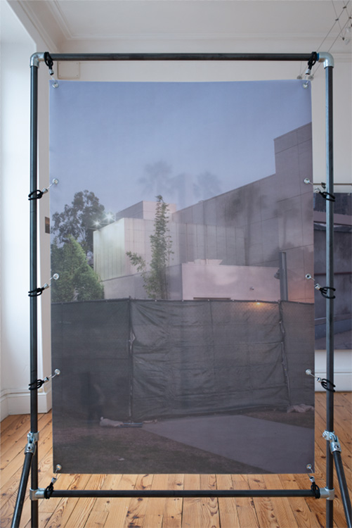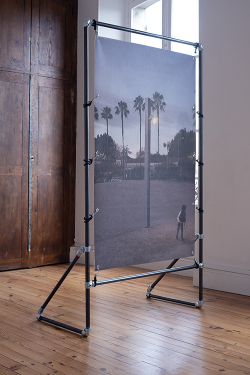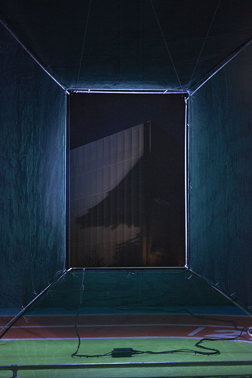 « Ombres portées est constituée d’une grande structure en acier galvanisé recouverte de filets de chantier, éclairée de l’intérieur par une série de rubans leds. De part et d’autre, deux photographies rétro-éclairées du chantier d’une pagode tokyoïte -juste avant et juste après l’extinction des lumières- sont maintenue par des tiges d’acier à béton. Cette structure, en reprenant et en exhibant les codes de l’architecture et de la construction, tant par ses formes que par ses matériaux, joue autant du télescopage que de la mise en abyme. Un principe d’élaboration que déploie à son tour son projet de film à venir qui intégrera les différents éléments sculpturaux de cet ensemble que Corentin Laplanche Tsutsui a intitulé Composite City.