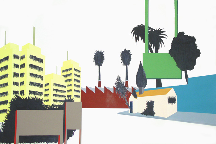La série des Archipaysages débute avec les croquis - un élément architectural coloré, débordé de vé- gétation noire qui sert de point de départ - comme un répertoire de formes possibles. Cette base de données est ensuite utilisée pour la réalisation de paysages d’architectures de formats plus grands. Cette série joue avec la fragilité de la perception et une perspective instable : une ligne d’horizon par éléments architecturaux, donc une accumulation de points de vue et de différentes échelles.